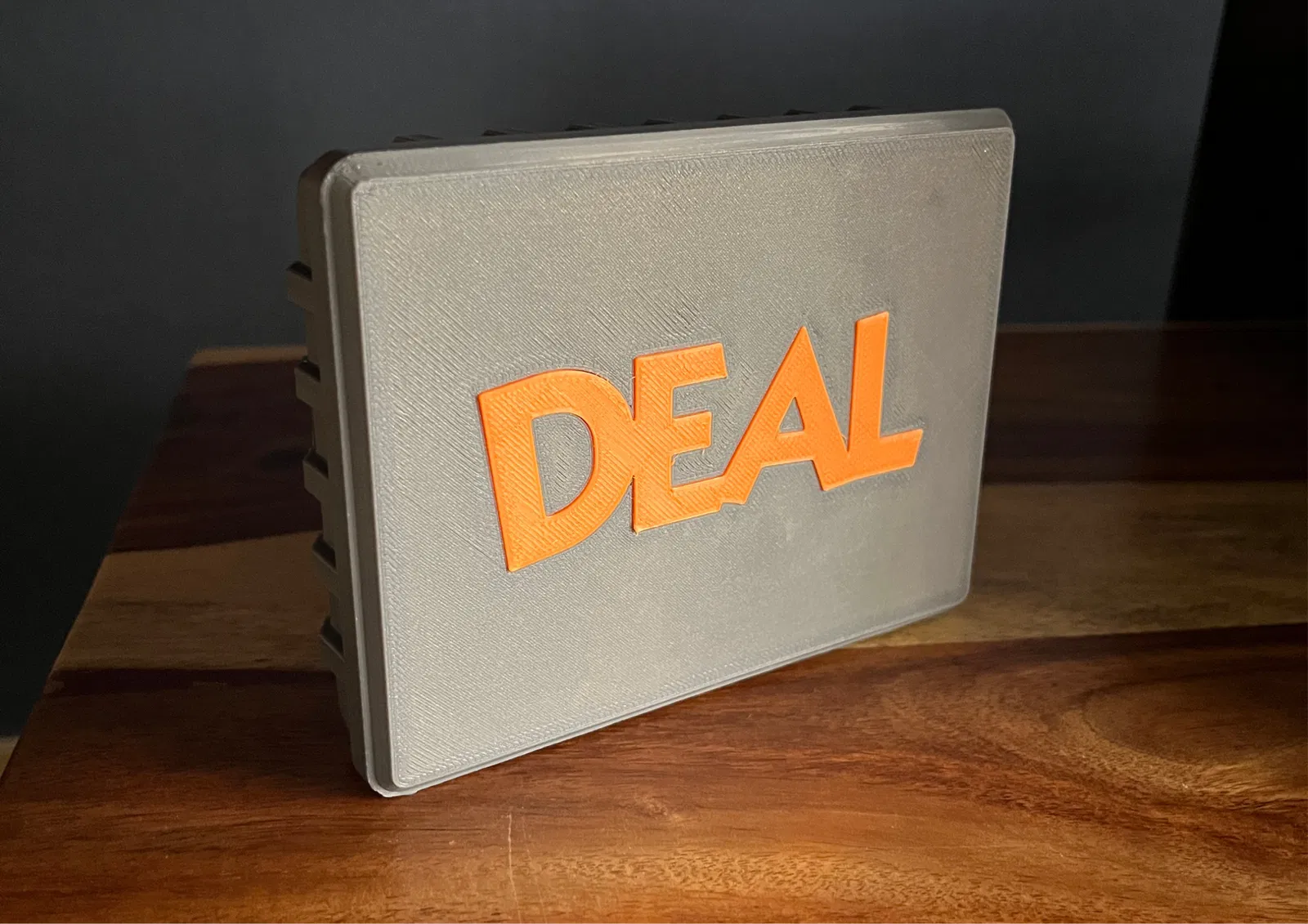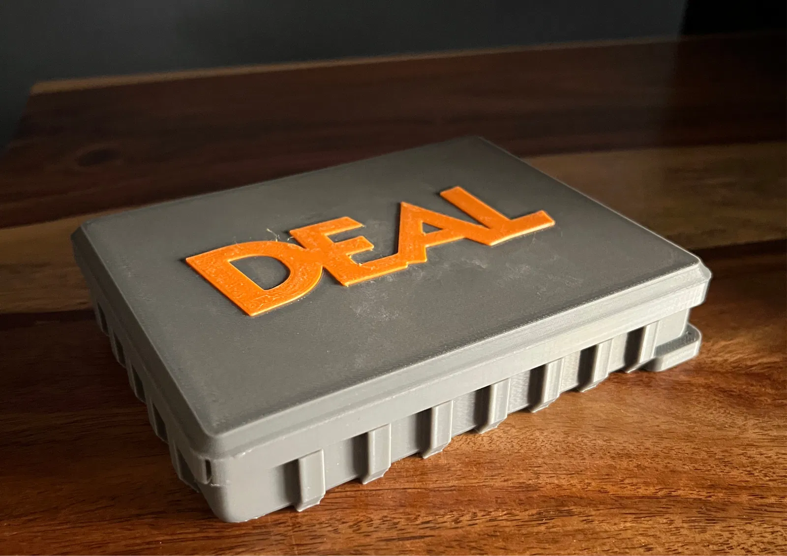 Anh em mê game bài Monopoly Deal, đây là giải pháp tuyệt vời để giữ cho bộ bài của mình luôn gọn gàng và an toàn. Hộp đựng được thiết kế thông minh với cơ chế "click-on" chắc chắn, giúp hai nửa hộp khớp chặt vào nhau, bảo vệ bài khỏi va đập, rơi rớt. Kích thước nhỏ gọn, lý tưởng để mang đi bất cứ đâu, từ nhà bạn bè đến những buổi dã ngoại. Việc in 3D cũng rất đơn giản, không yêu cầu máy in đa màu phức tạp. Hộp còn có thêm logo "DEAL" nổi bật, tăng tính thẩm mỹ và cá tính cho người sở hữu. Chất liệu in như PLA hay PETG sẽ đảm bảo độ bền bỉ. Hãy sở hữu ngay chiếc hộp này để trải nghiệm sự tiện lợi và bảo quản bộ bài yêu thích của bạn một cách tốt nhất nhé!