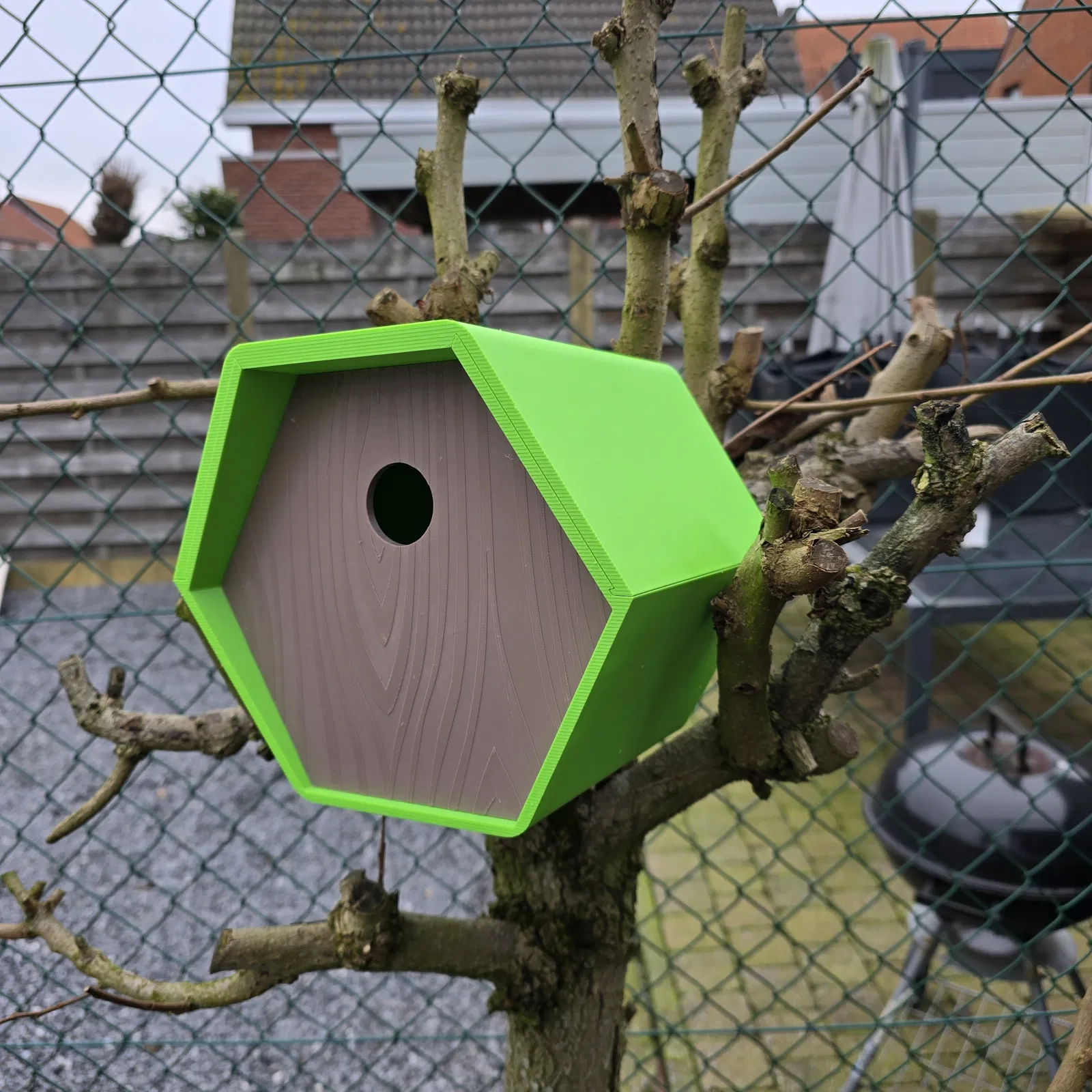 Mẫu nhà chim lục giác in 3D, file đã canh sẵn hướng in, không cần supports. Có 3 tấm mặt trước với nhiều cỡ lỗ để thu hút các loài chim khác nhau. Khuyên in PETG, phần top nên dùng brim để hạn chế warping.