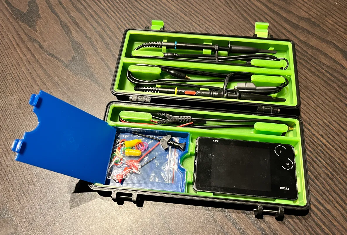 Hộp đựng DS212 storage case cho máy hiện sóng MiniDSO DS212, thiết kế dạng organizer lấy cảm hứng từ hộp TS101. In không cần supports, dùng PLA/PETG cho thân và TPU cho gioăng, lắp bằng 6 ốc M3x25.