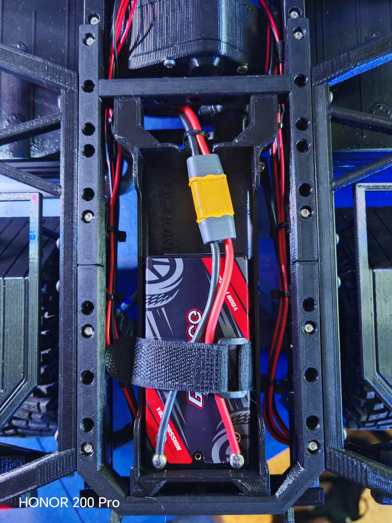 Bạn sẽ cần 4 con ốc lục giác đầu trụ 3x10mm (socket head screws). Lắp 2 con ốc hướng về phía đầu xe trước, rồi gắn battery holder vào để đầu ốc chui vô các lỗ trên chassis (phía trước). Sau đó bạn mới lắp 2 con ốc phía sau xuyên qua các lỗ sau của chassis. Lắp sẽ khít, rất vừa. Mình cũng làm sẵn lỗ để luồn dây đai (battery strap). Như bạn thấy, đầu ốc vừa khít với lỗ chassis nên nó sẽ giữ cái thùng cố định, gần như khỏi cần siết chặt. Mình thấy cách này giúp phân bố trọng lượng tốt hơn và xe cân bằng hơn. Mình đoán nó chỉ hợp cho bản 4x4, nhưng có thể chỉnh lại để dùng cho 6x6. Còn dây pin thì mình nối thêm một đoạn extension là xong.