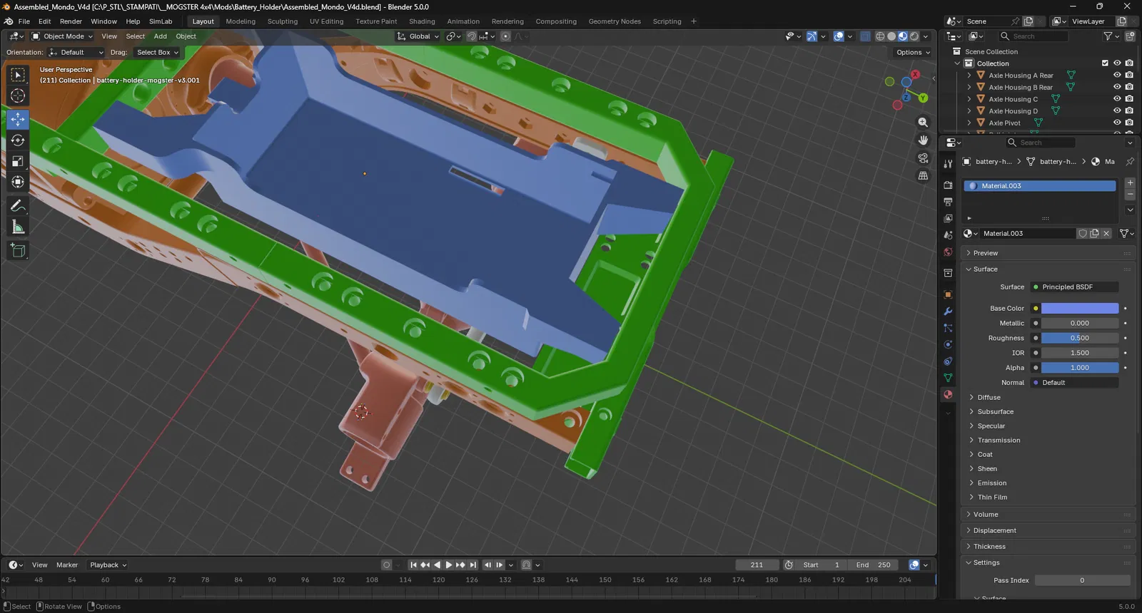 Bản Battery Holder cho Model 20+22 3D Set Mogster đã được chỉnh sửa để dùng pin cao hơn mà không vướng phần dưới thùng hàng, lùi vị trí để tránh differential và thanh sau khi gắn mod overland (dùng winch), kèm 2 gối đỡ đi dây LED phía sau.