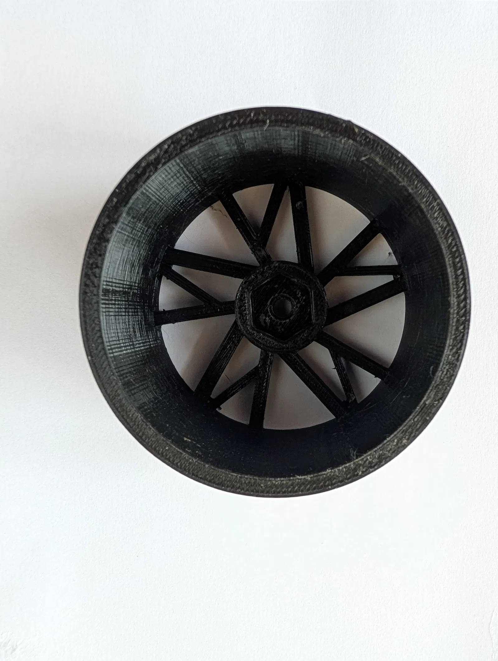Khi in, hãy để ngược (upside-down) – phần nan (spokes) sẽ được in "sau cùng". (Bản in bắt đầu từ thành mâm/rim wall.) Dùng supports ôm khít (Snug-fitting supports). Cách in này nhanh nhất và supports cũng dễ tách khỏi mâm.