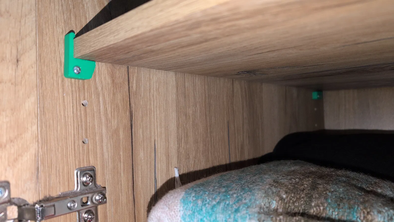 Kệ trong tủ của mình bị sập sau khi một trong mấy cái chốt (peg) giữ kệ vào thành tủ bị tuột/gãy — nên mình làm một cái ngàm đỡ/bệ đỡ lớn hơn, kèm thêm một con vít (screw) để gia cố (reinforcement) cho chắc. Bị thất lạc mẫu gốc, mình làm món này cách đây hai năm rồi; giờ cần in lại cái mới thì chỉ còn tìm thấy file nằm trong máy in của mình thôi.
