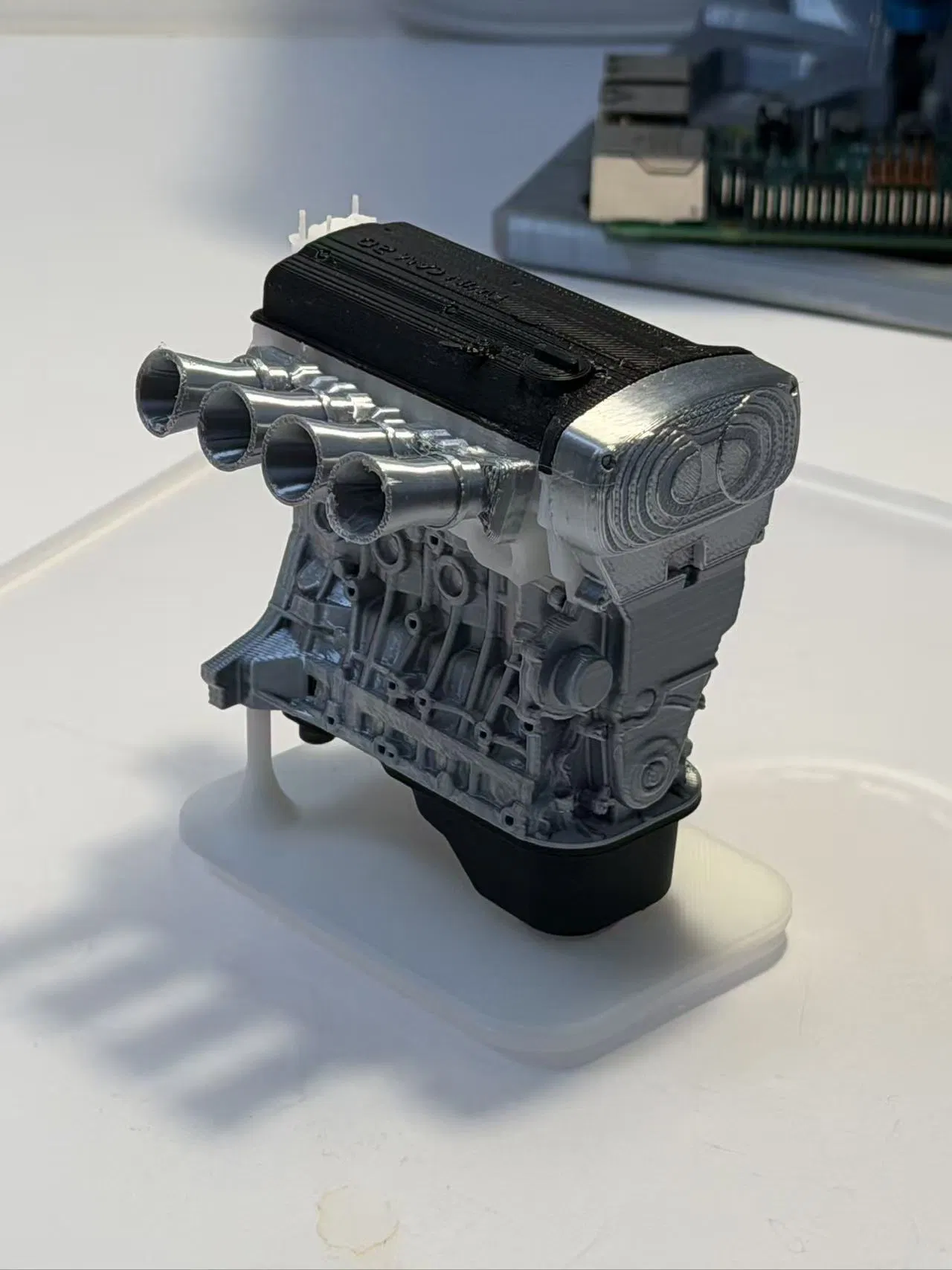 Mô hình 3D in được của động cơ Toyota 4A-GE 20V Inline-4, dựng từ scan gốc rồi remesh và tối ưu cho FDM/resin. Có intake trumpets, exhaust headers, đế trưng bày và cấu trúc lắp modular; lắp cần keo CA.