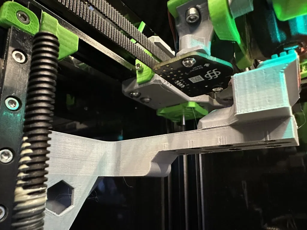 Bucket được cố định vào main arm bằng 8 cặp nam châm 6mm x 3mm. Bucket chỉ lắp đúng theo một chiều — để số version ở phía trước. Số lượng nam châm này có thể hơi dư, nhưng đây là loại nam châm rất phổ biến nên giá cũng mềm; mình muốn nó bám cho chắc. Mình phải dùng nam châm để bucket gắn từ mặt dưới của main arm, để không có gì cản Beacon probe. Hai cái “cánh” trên bucket cũng được thiết kế để không quẹt vào toolhead.