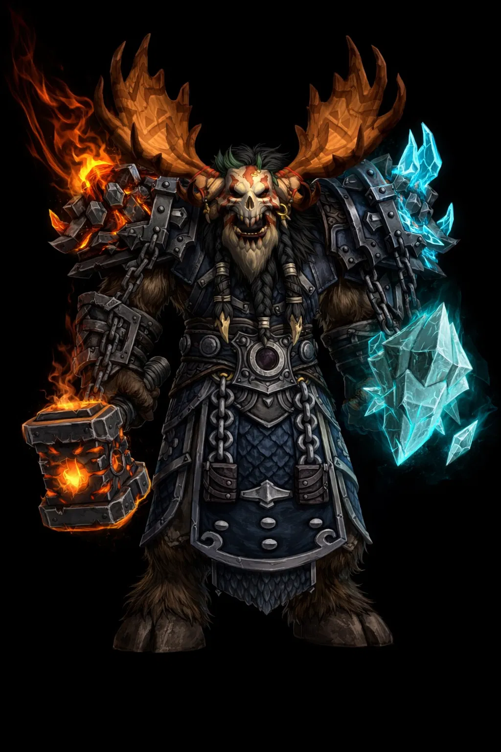Với thiết kế hầm hố, bộ giáp dày cộm cùng cặp sừng uy nghi trên đầu, mô hình Tauren toát lên vẻ oai phong lẫm liệt của một chiến binh dày dạn trận mạc. Điểm nhấn đặc biệt chính là đôi tay của Tauren, một bên rực lửa như dung nham, tay kia lại tỏa ra khí lạnh băng giá, tượng trưng cho hai thái cực sức mạnh đối lập. Cách các nghệ nhân 3D đã tái hiện lại các chi tiết này thật sự đáng kinh ngạc, từ vảy giáp bóng bẩy, những sợi dây xích kim loại nặng trịch cho đến hiệu ứng lửa và băng tan chảy thật sống động.