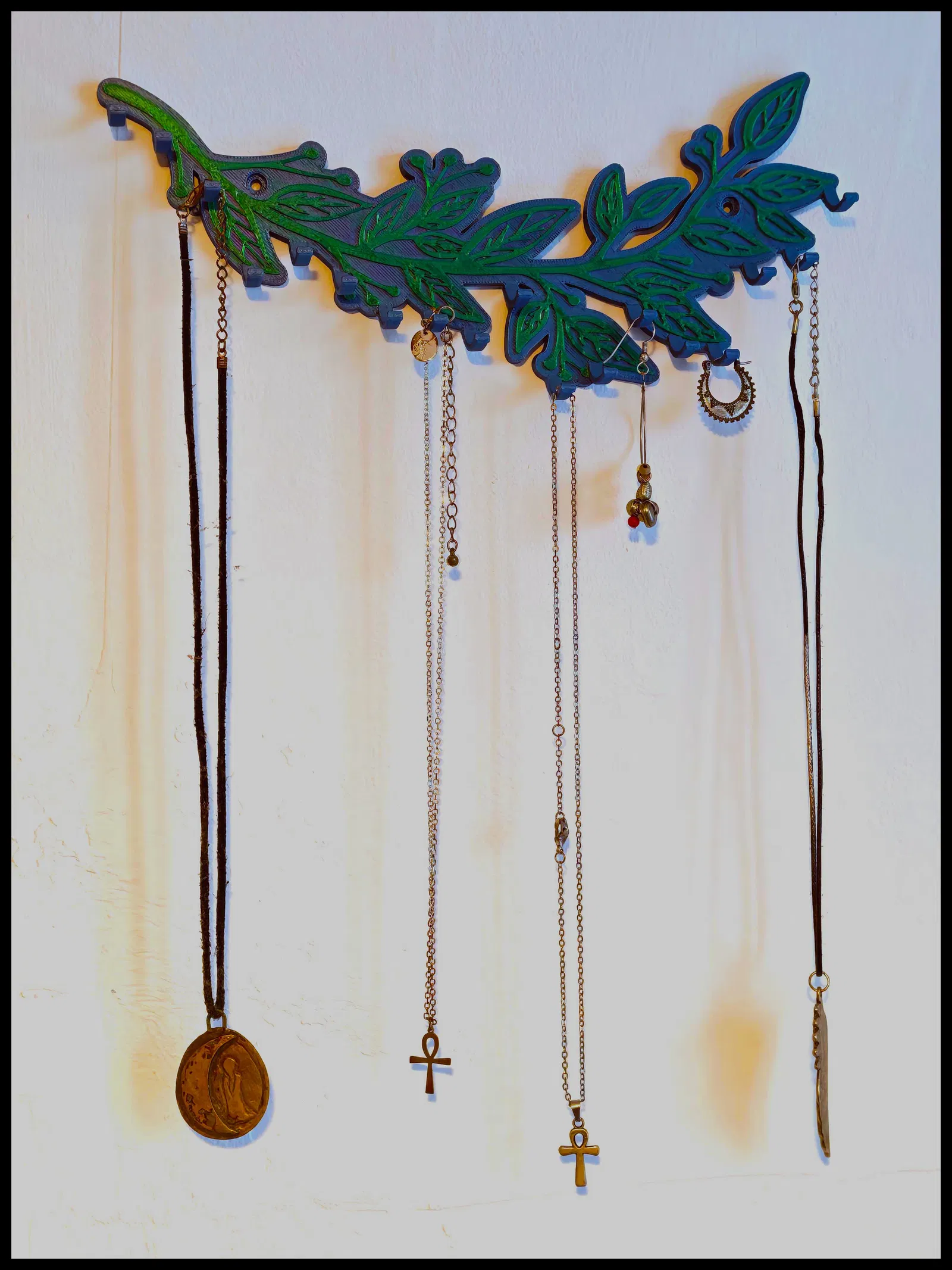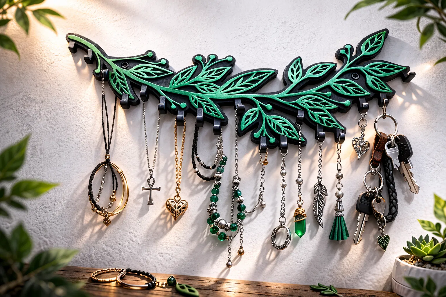 Móc treo tường nghệ thuật dạng nhánh lá, có nhiều móc nhỏ để treo chìa khóa, vòng cổ, phụ kiện. Thiết kế phù hợp in hai màu để nổi chi tiết lá; có thể bắt vít M4 hoặc dán keo/băng keo 2 mặt.