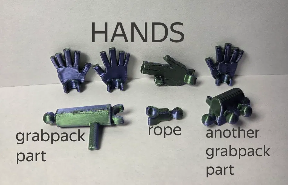 Phụ kiện grabpack cho Dummy13. Hãy in Dummy13 trước, rồi in backpack, 6 ropes, 2 grabpacks và 2 hands để đủ bộ. In đúng hướng/lắp theo hình để tránh bị gãy nhanh. Sẽ có thêm mẫu tay sau chapter 5.