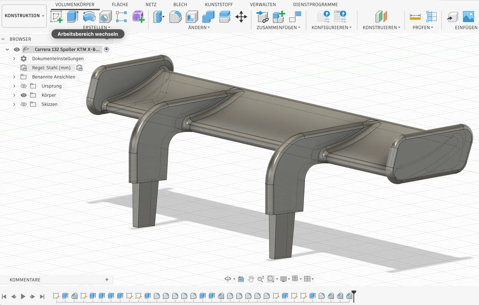 Cánh gió sau (rear wing/spoiler) cho xe slot Carrera 132 KTM X-Bow (Evolution/Digital) tỷ lệ 1:32. Khuyến nghị úp mặt sau xuống bàn in để thanh chống chắc hơn; in xong chà nhám nhẹ chỗ support. Có kèm file *.f3d (Fusion360).