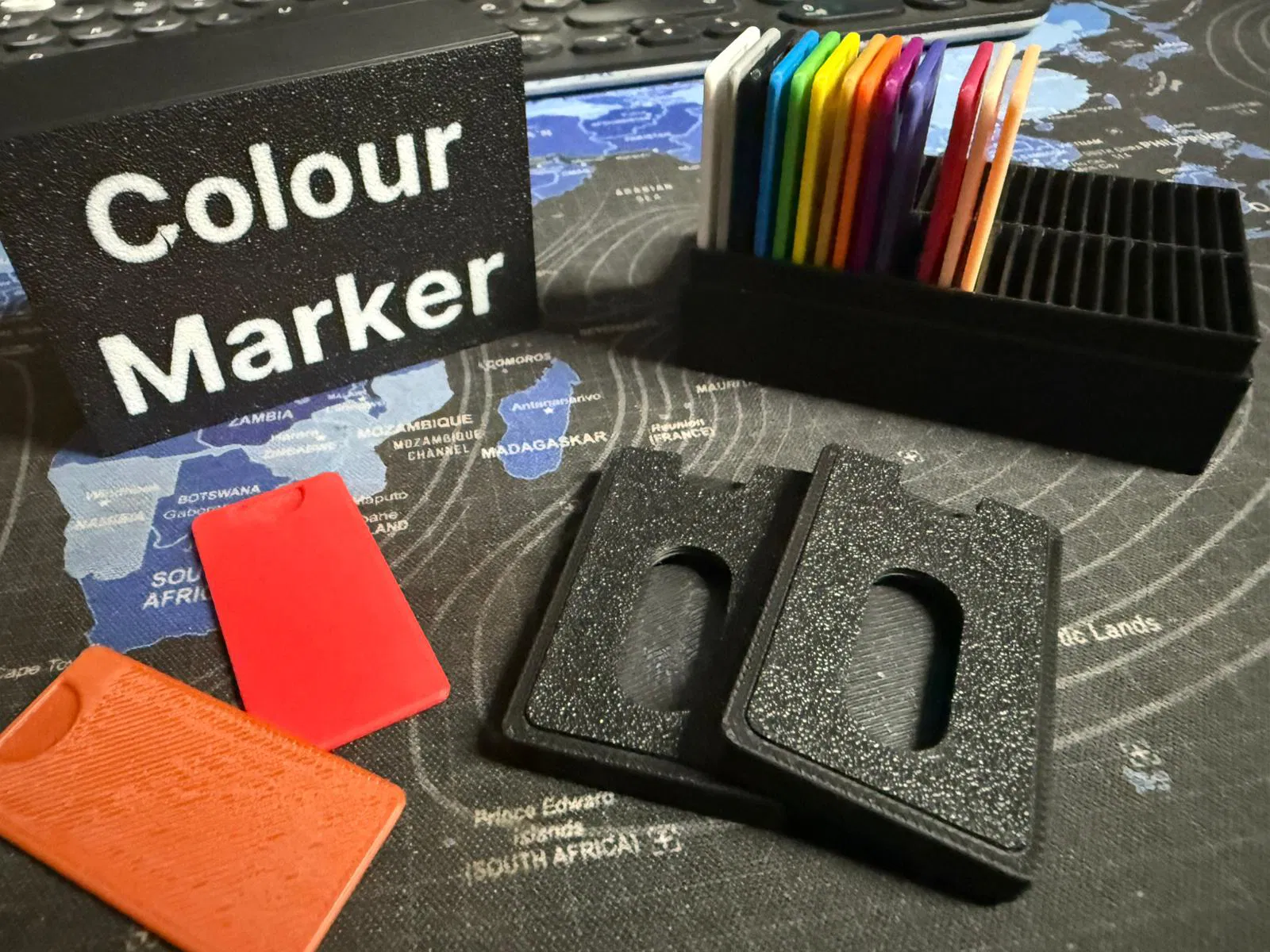 Bộ color swatches để quản lý và cất trữ filament gọn gàng: in marker kèm holder và hộp nhỏ, giúp nhìn là biết ngay trong hộp có loại filament nào. Có thể dùng màu holder khác nhau để phân loại PLA/TPU, v.v.
