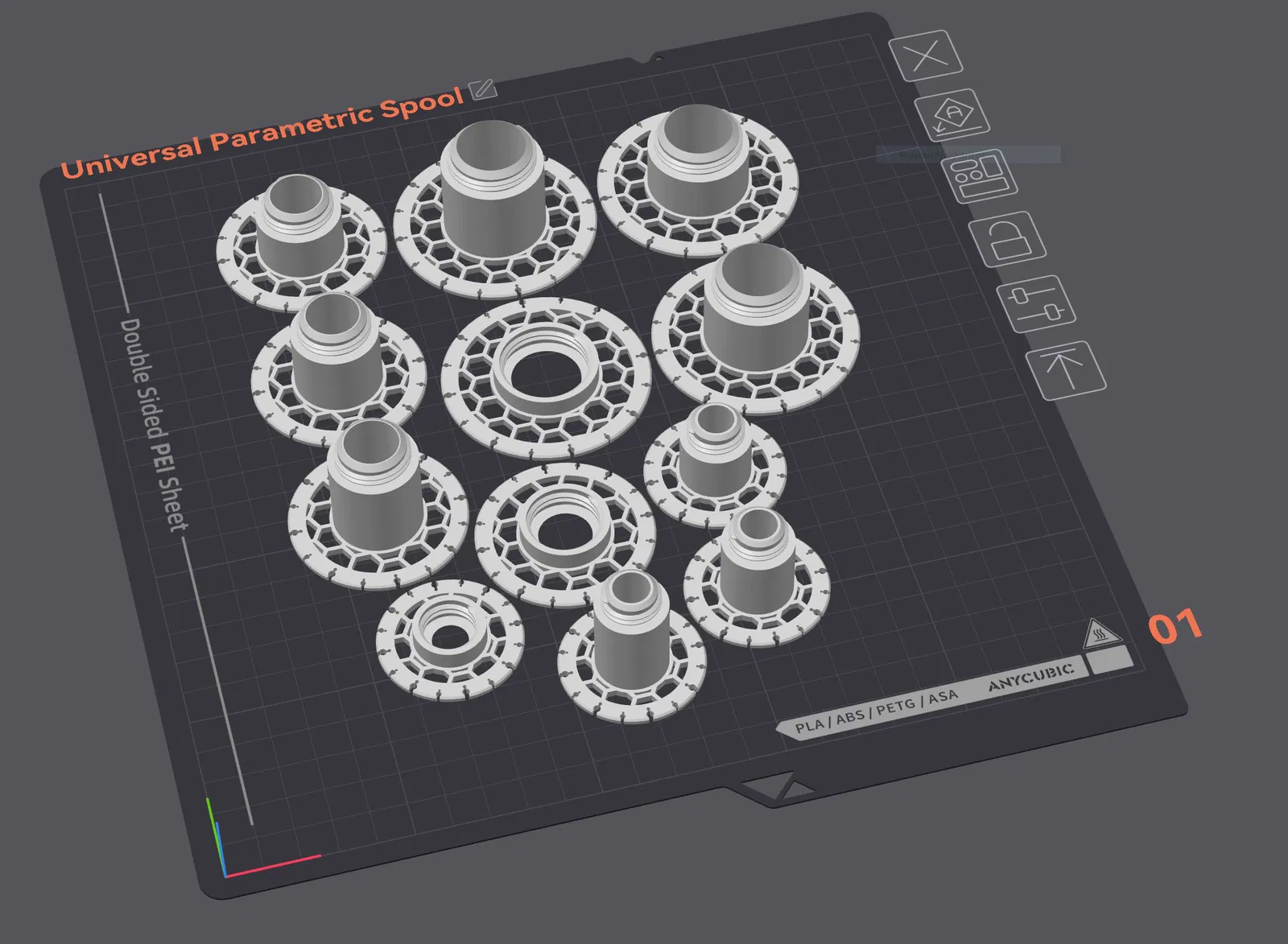 Spool in 3D dạng vặn ren gồm Top/Bottom, không cần keo hay ốc vít. Dùng quấn dây điện, thiếc hàn, dây thừng; có khe giữ đầu dây, lỗ neo lõi, họa tiết honeycomb. File STL nhiều size và SCAD tuỳ biến trong OpenSCAD.