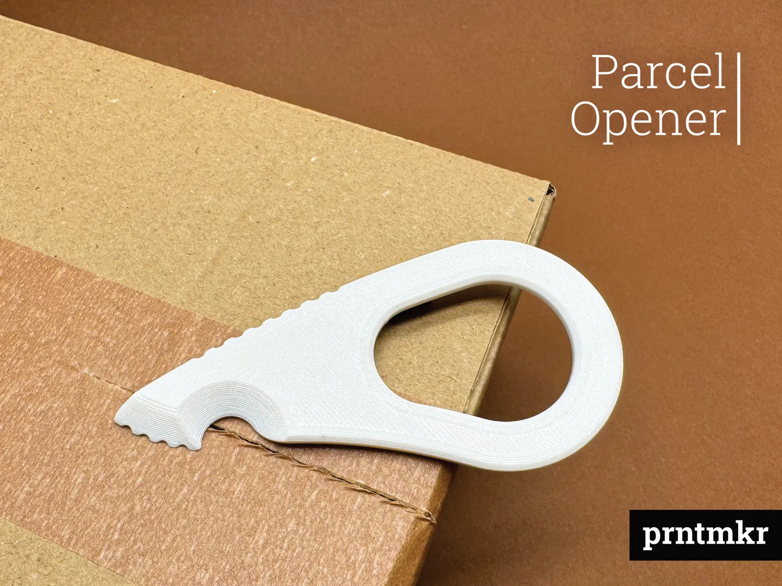 Dụng cụ mở bưu kiện thiết kế công thái học, giúp luồn dưới băng keo và rạch mở thùng carton nhanh gọn mà không cần lưỡi dao kim loại. Nhỏ gọn, nhẹ, in nhanh và dùng bền cho nhà, xưởng hay văn phòng.