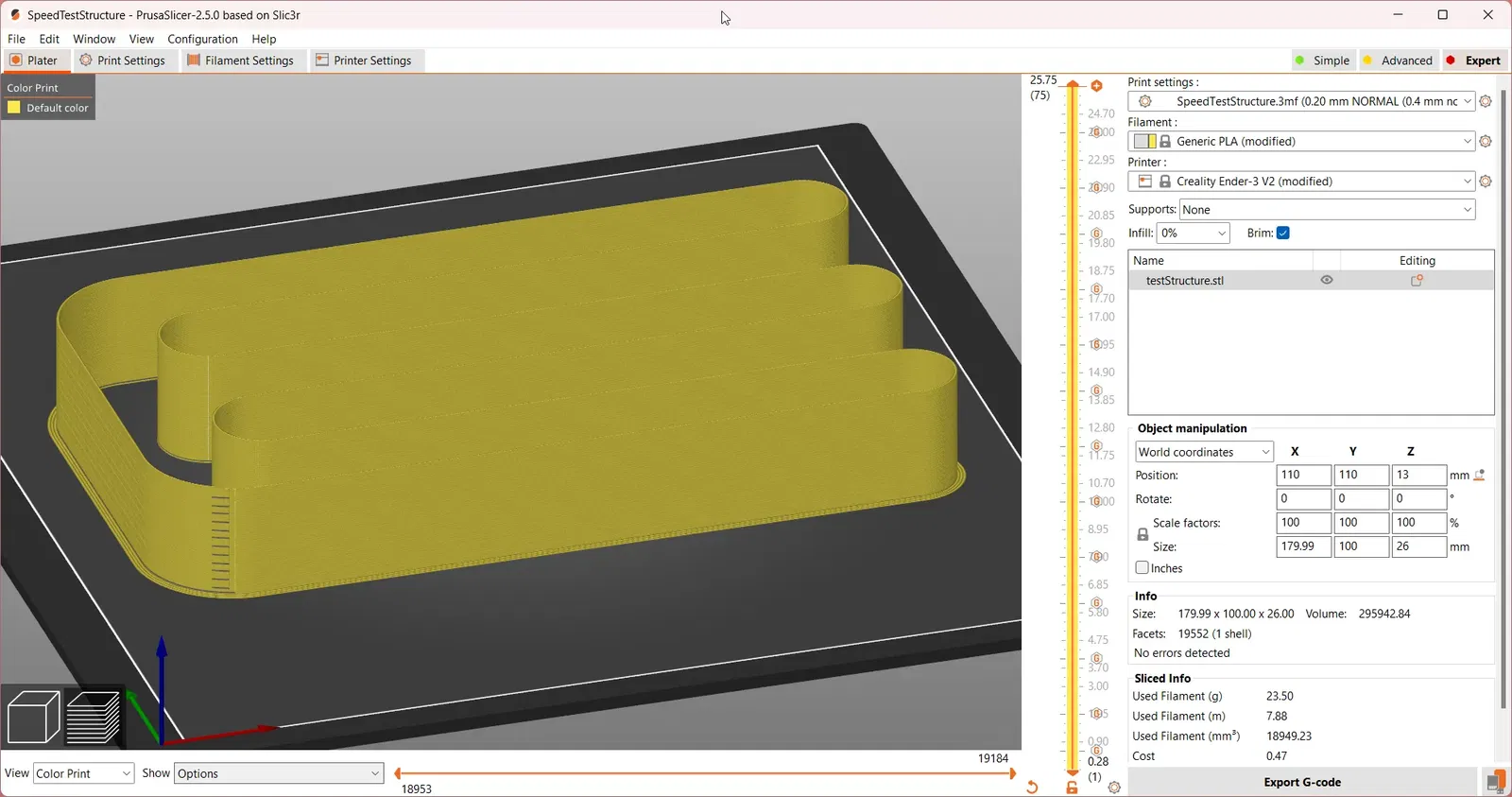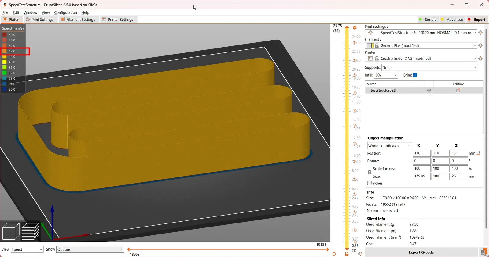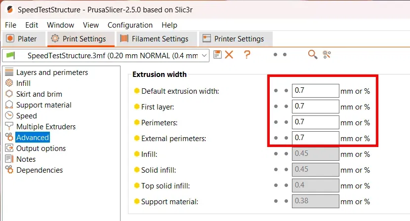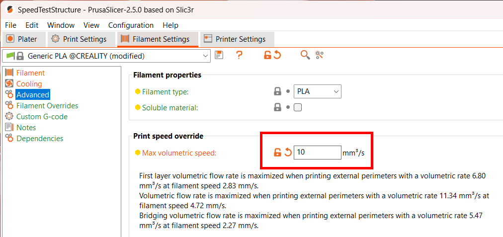 - Giới hạn lưu lượng tối đa dưới cài đặt filament nâng cao là 10 mm³/s (điều này sẽ dẫn đến toàn bộ cấu trúc được in ở tốc độ 10 mm/s, điều này rất tốt để phân tích)