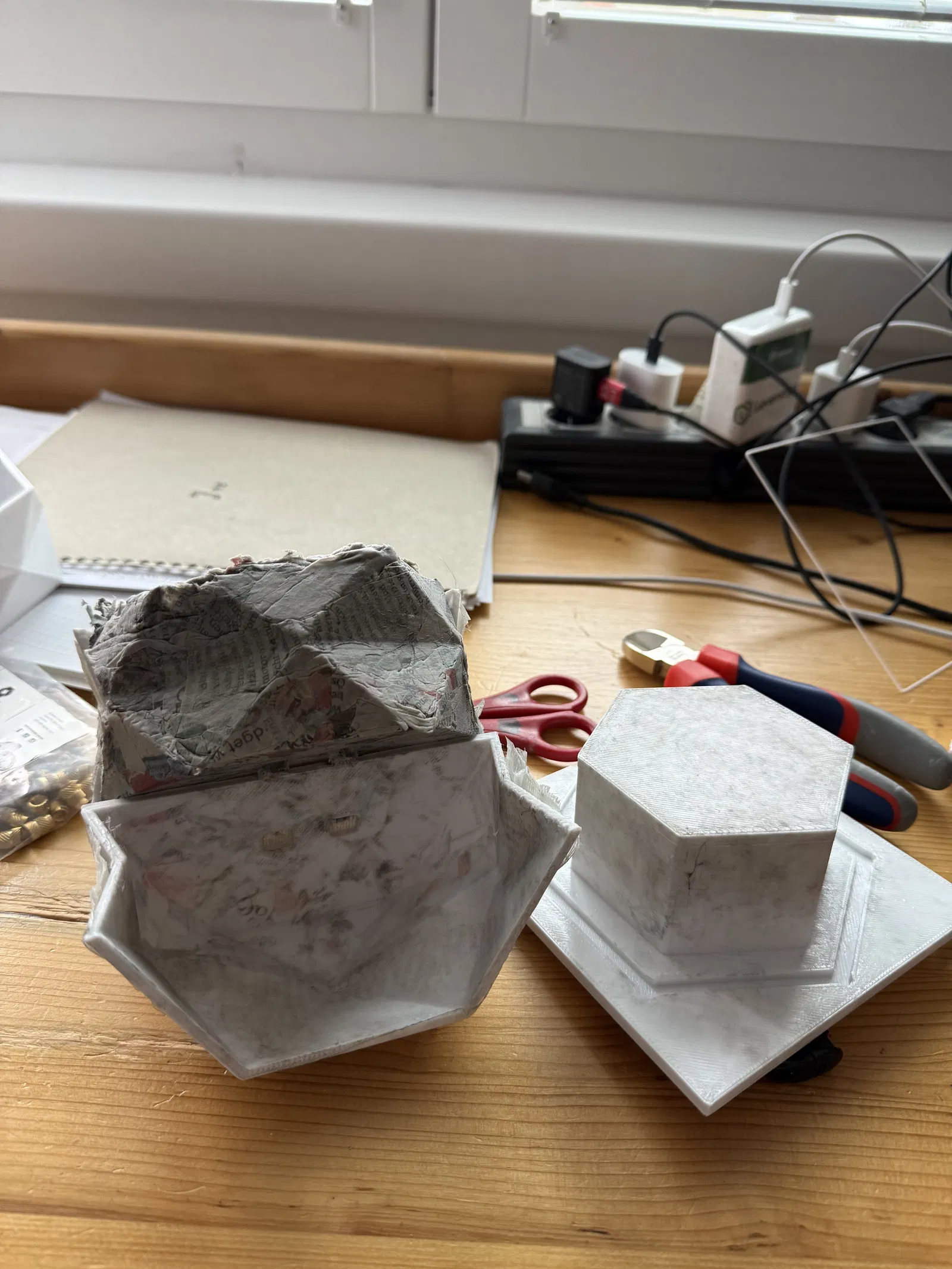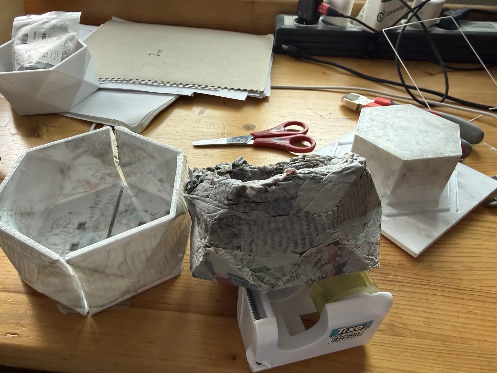 Khuôn 3D print tái sử dụng gồm 2 nửa đối xứng và phần press, giúp ép giấy/bìa carton ướt tạo bình hoa lục giác faceted. Thành phẩm nhẹ, thân thiện môi trường; có thể phủ seal hoặc lót ly thủy tinh để cắm hoa.