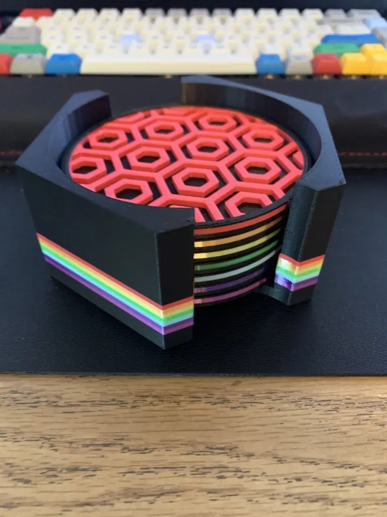 Một bộ lót ly và giá đỡ lót ly. Tôi đã sử dụng các màu thay thế để đạt được hoa văn hình lục giác. Tôi bắt đầu với màu đen, thay đổi ngay sau khi lớp cuối cùng của hình tròn được in, sau đó đổi lại thành màu đen sau khi các hình lục giác hoàn thành.