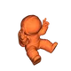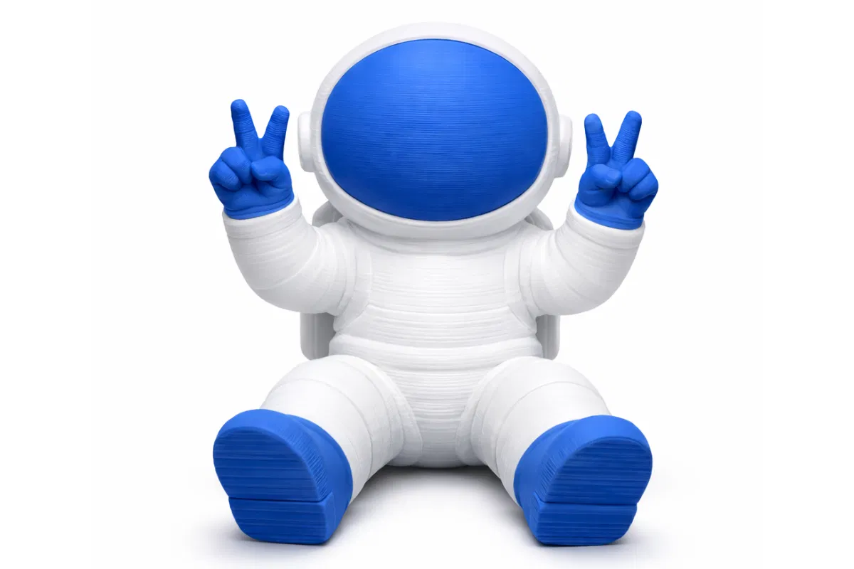Mô hình là một phi hành gia kiểu cartoon đang ngồi, đội mũ bảo hộ tròn bự quá khổ và mang đôi ủng dày “bự con” giúp đứng vững tại chỗ. Cả hai tay đều giơ lên làm dấu hòa bình, tạo dáng vui nhộn, hơi kiểu ăn mừng. Bộ đồ được in bằng filament trắng sạch sẽ, và bạn có thể thấy những đường layer ngang mảnh ôm quanh thân như các đường đồng mức trên một tấm bản đồ địa hình tí hon.