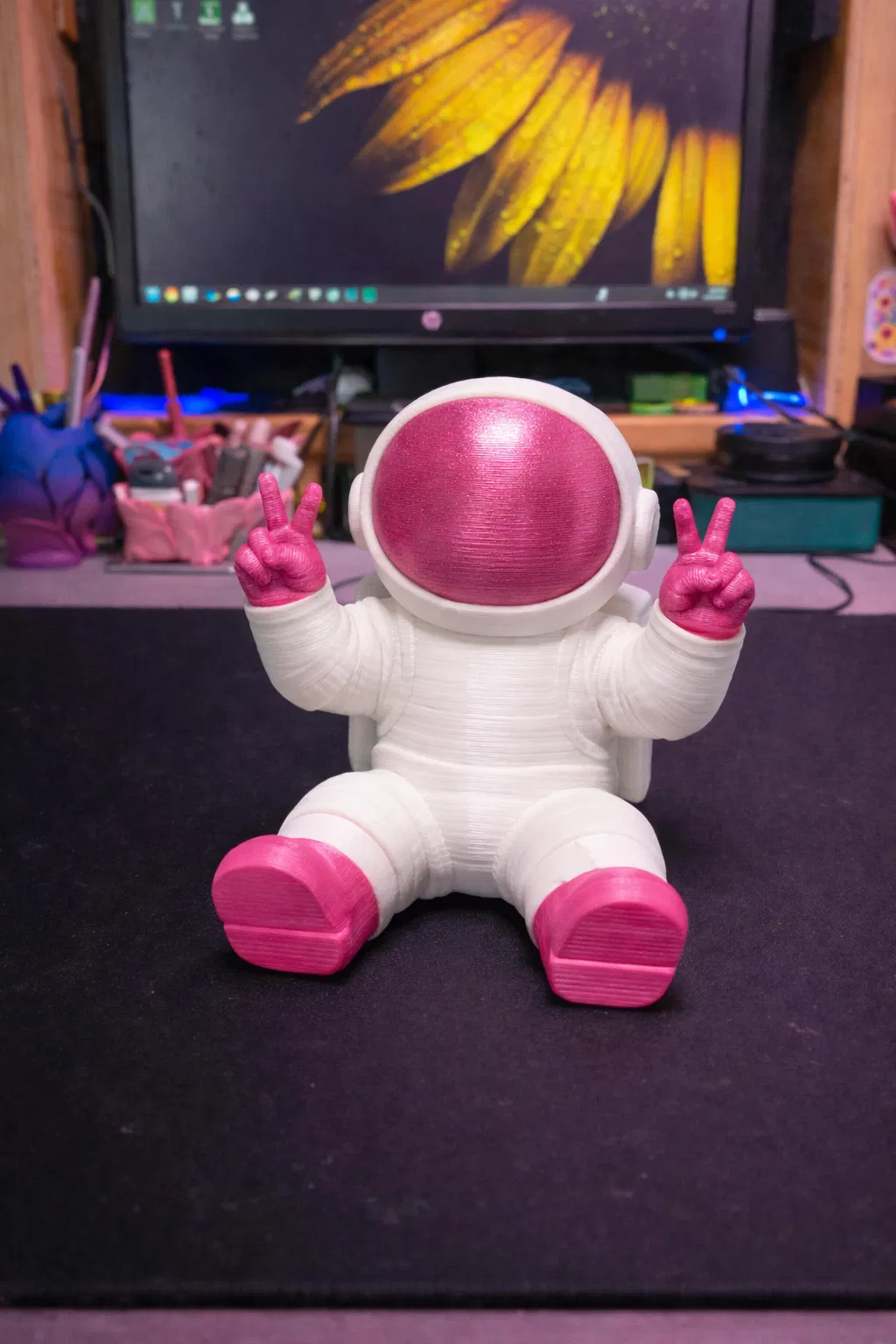 Phần kính visor của mũ, găng tay và ủng được hoàn thiện bằng filament hồng rực, tương phản rõ rệt với bộ suit trắng. Màu hồng có độ mịn và hơi bóng nhẹ, bắt sáng trên phần visor cong, làm nổi bật hình cầu của chiếc mũ. Đôi ủng dày và bo tròn tạo cảm giác chắc chắn, “đứng đắn” dù chủ đề thì rất vũ trụ.