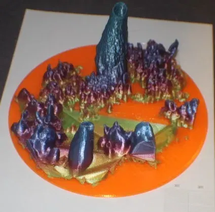 Cố gắng đầu tiên đã gặp sự cố lệch lớp ở khoảng 25-30mm PLA. Việc in đã dừng lại trước khi hoàn thành. Có thể cắt thành từng mảnh để lấp đầy phong cảnh.