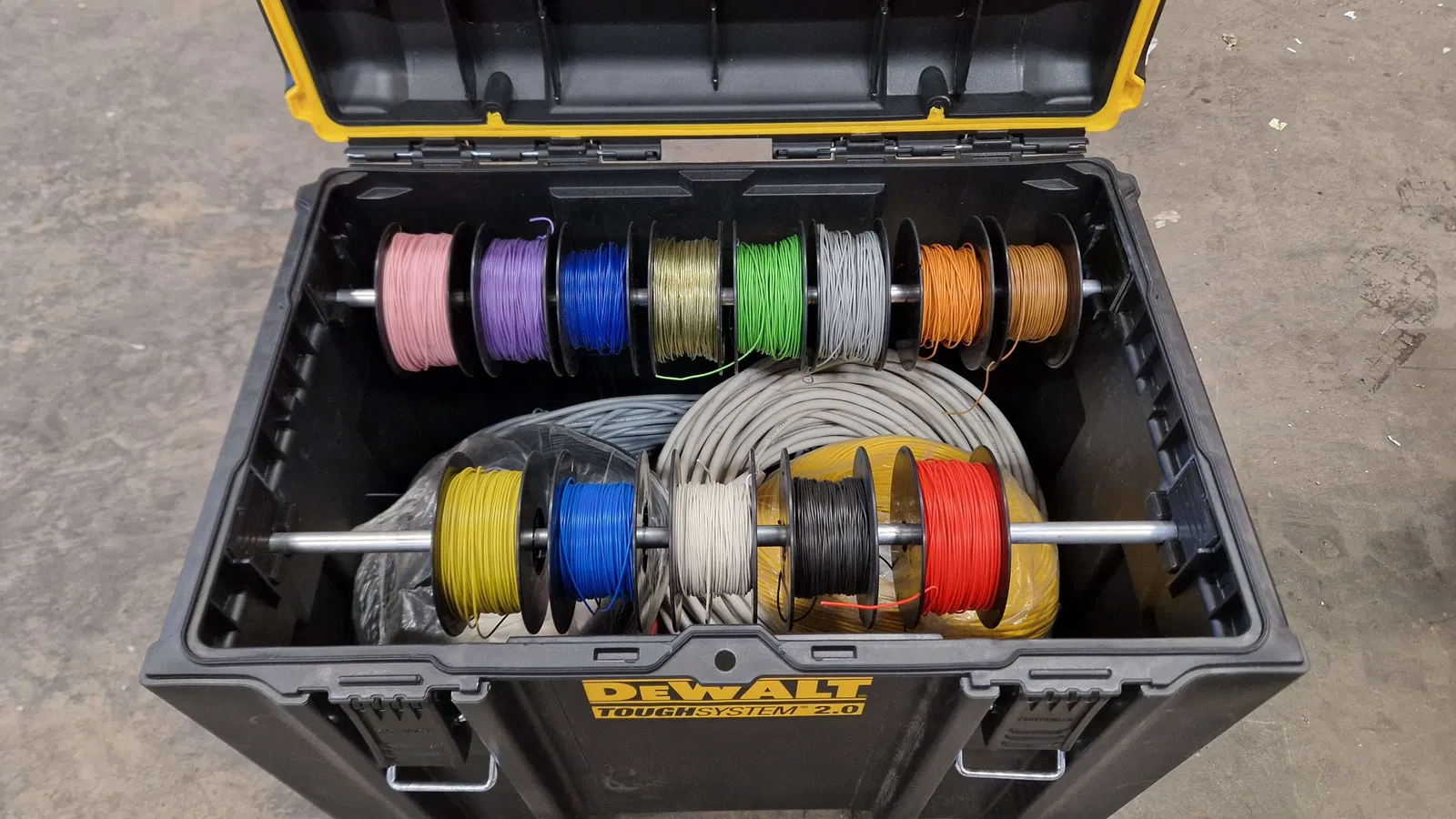 Anh em thợ mộc, thợ điện hay anh em làm sáng tạo 3D mà hay dùng dây cáp, dây điện, hoặc các loại sợi filament in 3D thì việc bảo quản và sắp xếp gọn gàng là cực kỳ quan trọng. Nhiều lúc cần tìm đúng loại dây, đúng màu mà lục tung cả hộp lên thì mất hết cả hứng làm việc. Hiểu được vấn đề đó, hôm nay mình giới thiệu đến anh em một món đồ "must-have" cho chiếc hộp DeWALT ToughSystem huyền thoại của mình: Giá đỡ cuộn dây (Wire spool holder).