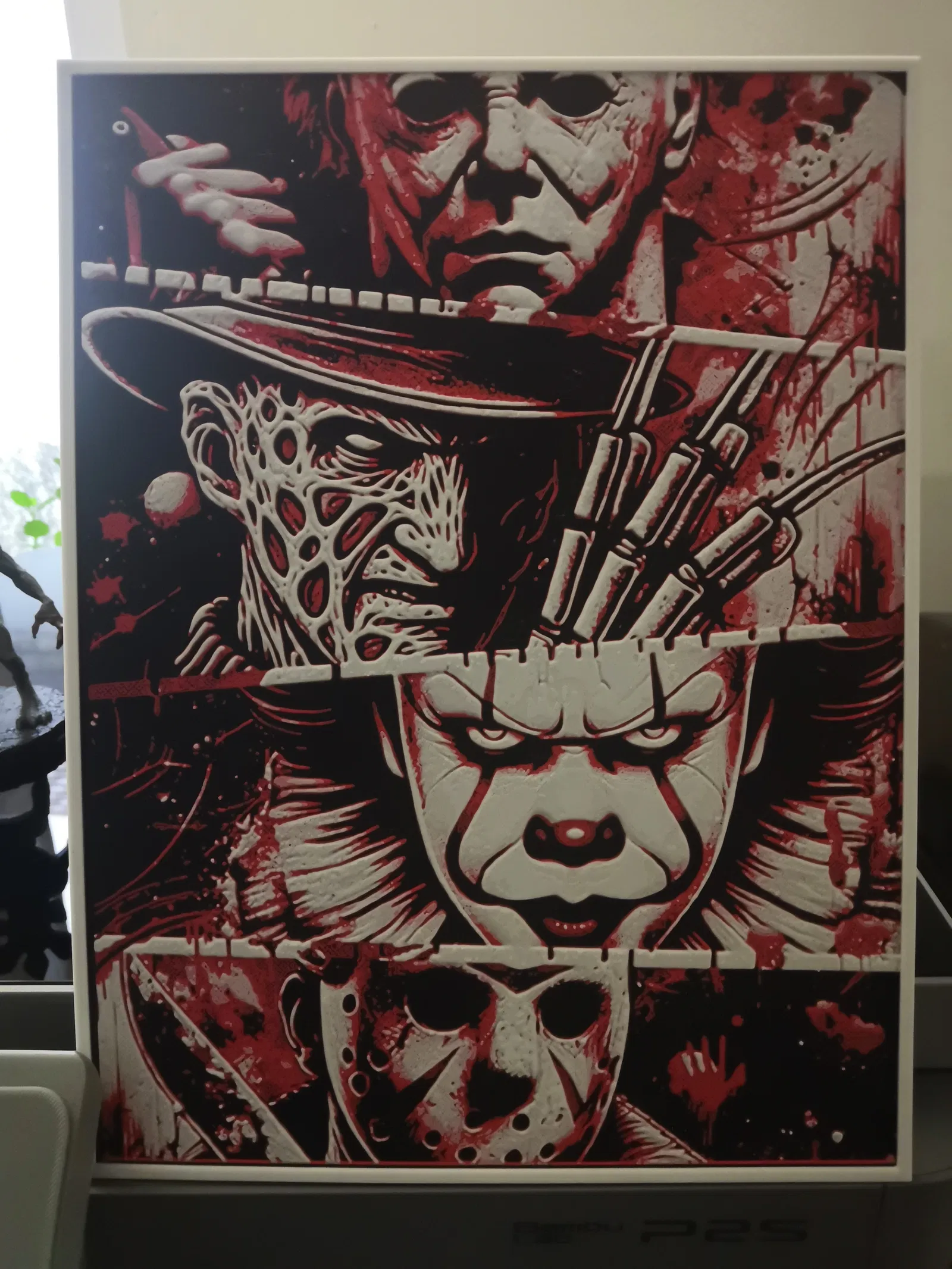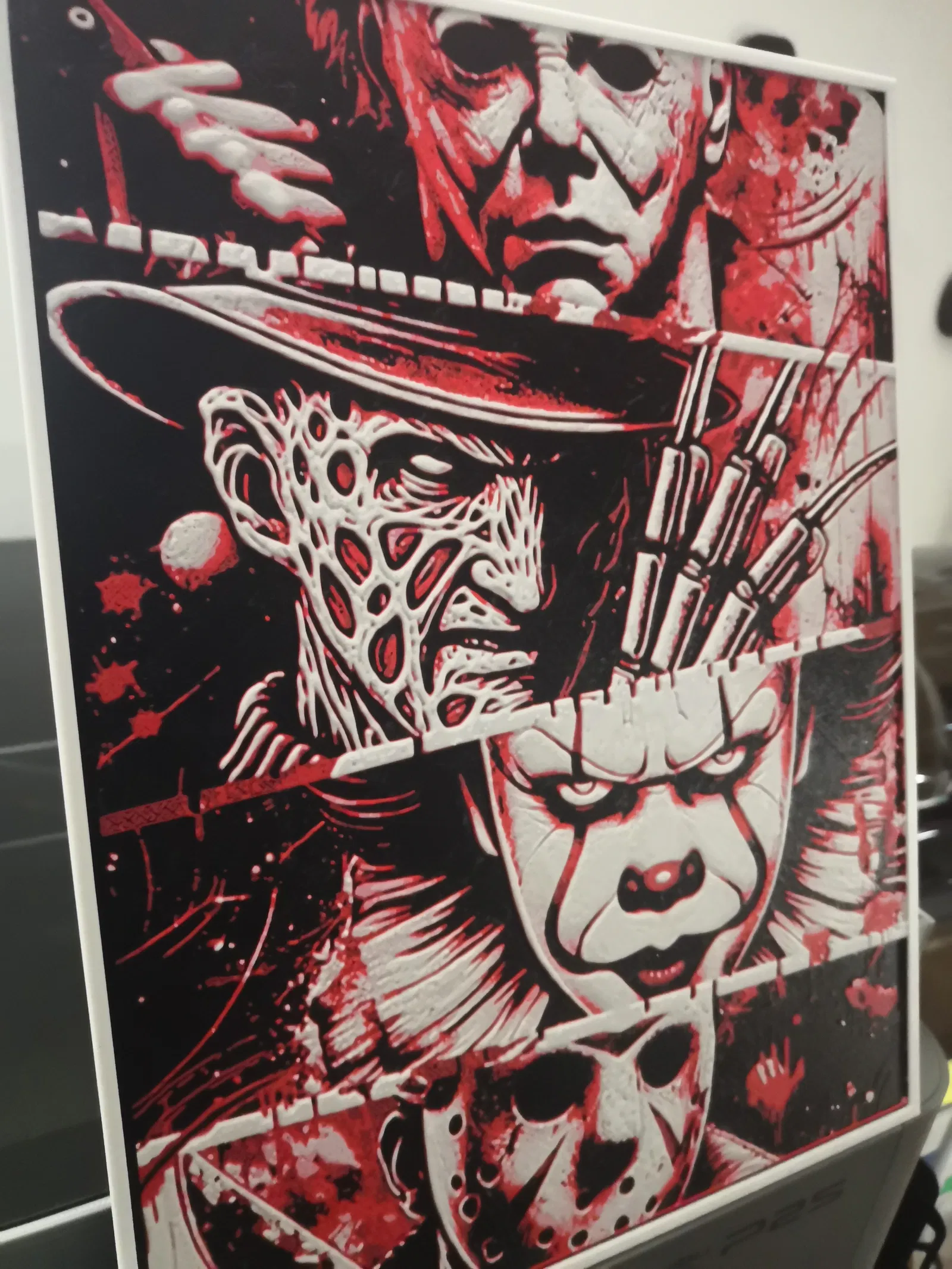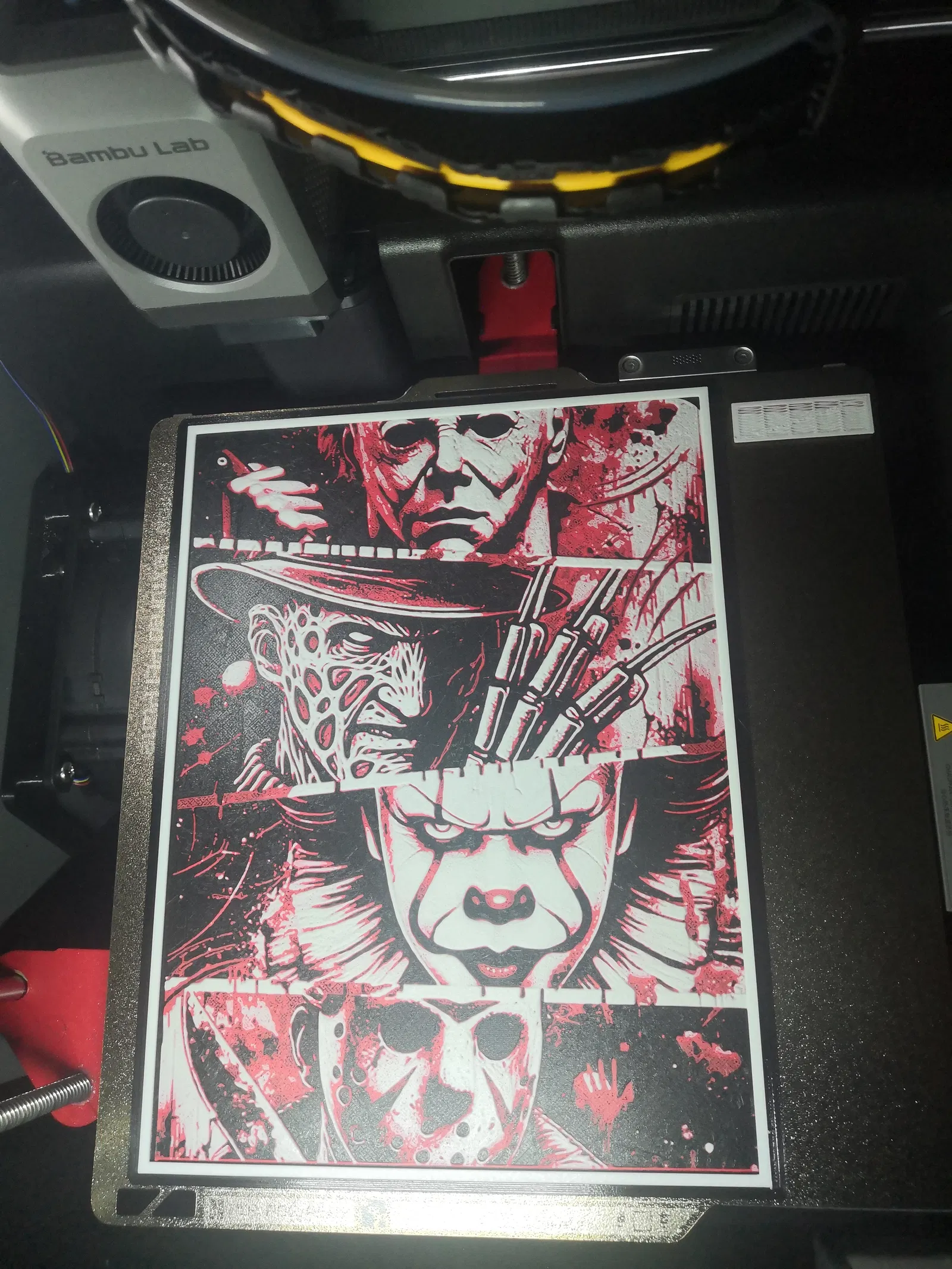 Scary 4 HueForge kích thước 186.99×250mm (187×250mm). In 100% infill, layer height 0.08mm (base 0.16mm). Dùng 4 filament PLA (Black/Red/Light Gray/White) và đổi màu theo các mốc layer đã hướng dẫn.