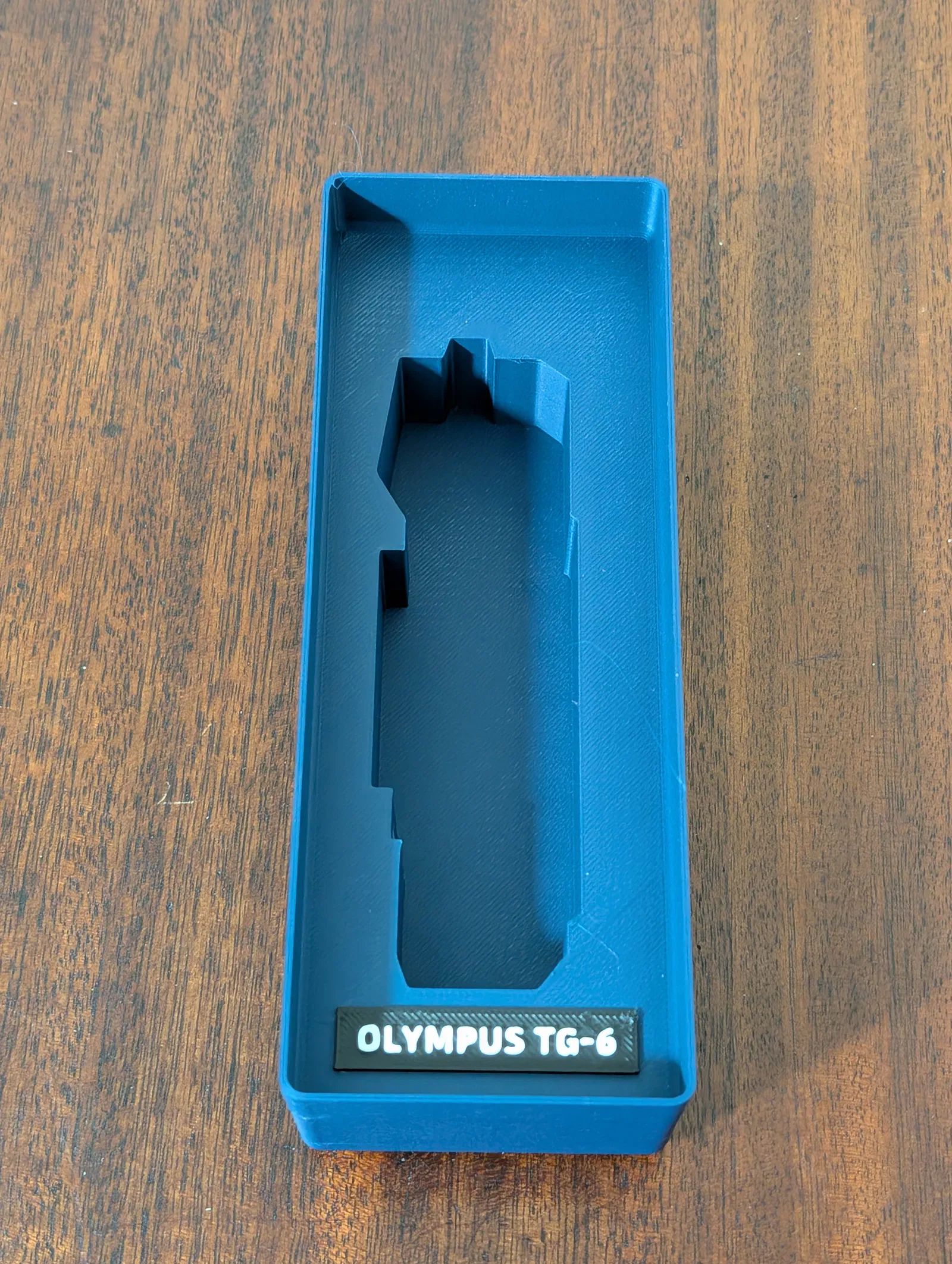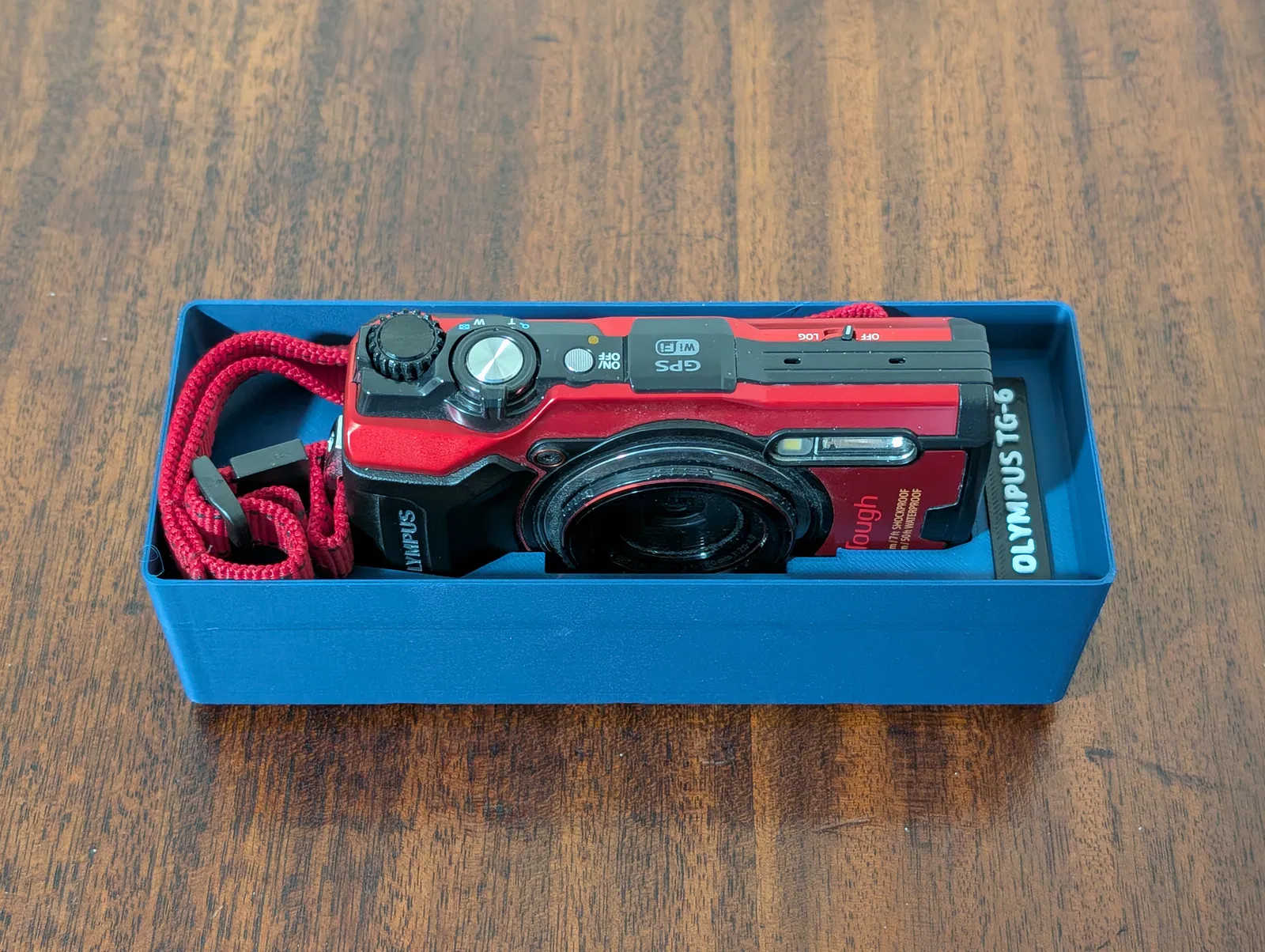 Mẫu này dành cho máy ảnh Olympus TG-6. Để máy theo kiểu dựng đứng, chừa một chút khoảng trống cho dây đeo. Đây là mẫu rộng 1.5 grid nên bạn có thể ghép với các bản in half-grid khác, hoặc tận dụng phần không gian dư ở cạnh của grid.