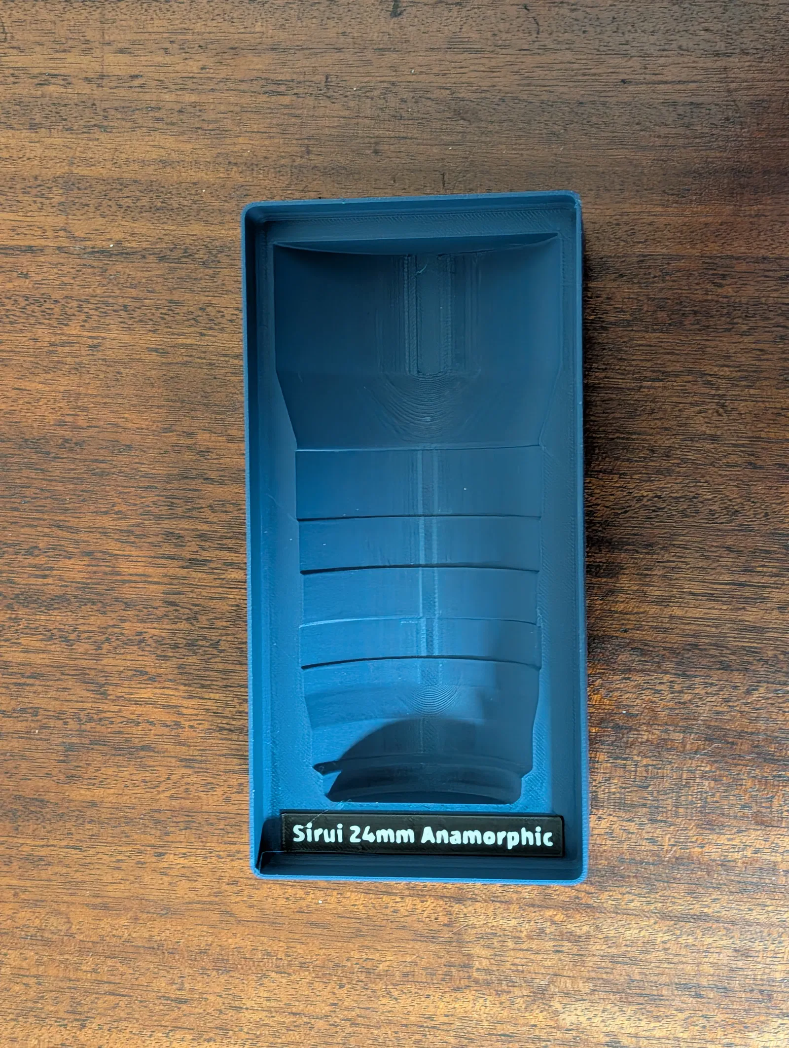 Giá đỡ tương thích Gridfinity cho ống kính Sirui 24mm Anamorphic ngàm Micro 4/3. Thiết kế tách riêng phần holder và label để bạn in 2 màu khác nhau nếu thích; có ví dụ in trên Snapmaker U1.