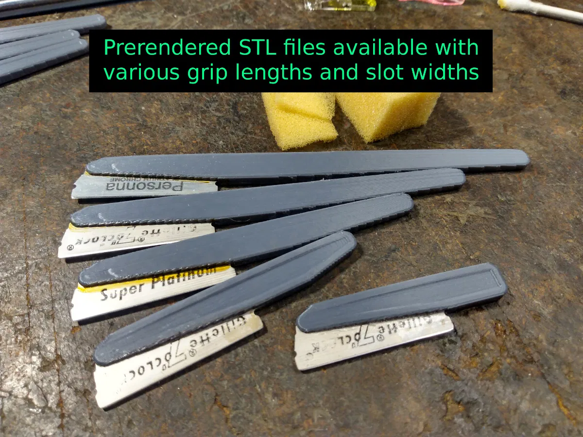 Trong bộ có sẵn STL đã render cho nhiều chiều dài cán khác nhau, và nhiều mức khe (slot) clearance khác nhau, cũng như độ thò lưỡi (blade stickout). Cũng có STL cho nắp che lưỡi dạng trượt vô (slip-on) đơn giản. Nên chọn chiều dài nào? Bản 80–100mm (tổng chiều dài OAL 110–130mm) sẽ cầm thoải mái kiểu cầm ngửa (underhand grip) như cầm cây bút chì. Cán ngắn hơn tốn ít vật liệu hơn, và có thể thoải mái hơn khi cầm kiểu úp (overhand grip) như cầm dao rọc giấy hoặc cầm lưỡi trần.