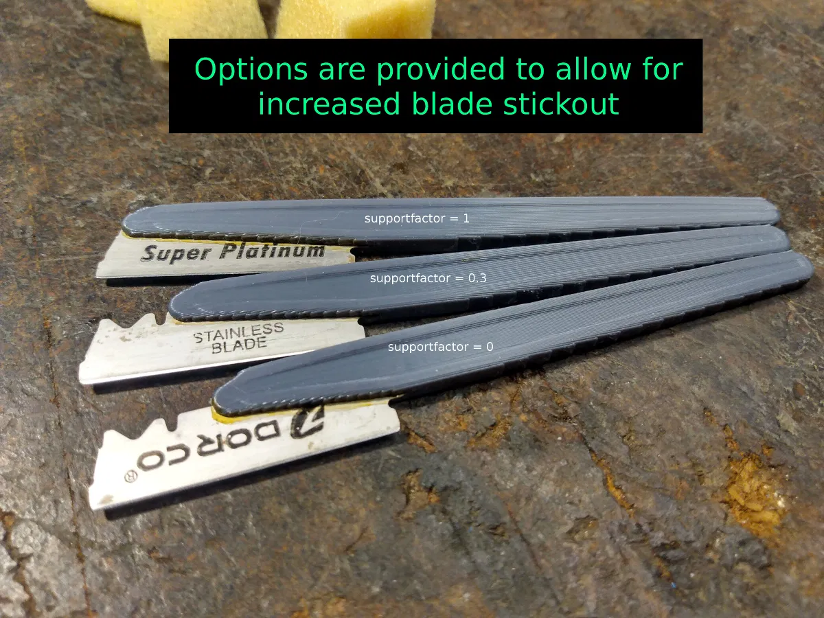 Mình làm cái này để tận dụng đống lưỡi dao cạo đã dùng mình tích luỹ. Lưỡi mà cùn quá để cạo mặt cho êm thì vẫn còn bén dư sức cho mấy nhu cầu cắt gọt kiểu “utilitarian”. Dĩ nhiên bạn có thể dùng lưỡi mới (virgin blades), nhưng theo mình thì không có lý do gì để tốn tiền xài lưỡi mới mà chẳng được lợi ích rõ rệt. Nếu bạn không cạo râu bằng lưỡi DE mà (vì lý do gì đó hơi lạ) vẫn muốn dùng mẫu này, thì lưỡi DORCO rẻ cũng ổn — nhưng nếu đã định mua lưỡi chỉ để làm “scalpel” in 3D, mình khuyên nên mua luôn lưỡi scalpel thật để dùng với bất kỳ mẫu cán scalpel in 3D nào ngoài kia.