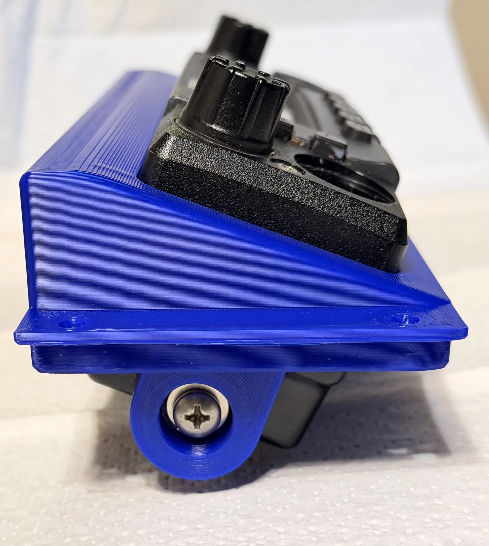 Bữa trước tôi chạy chiếc xe này đem đi bảo dưỡng mà ngồi ghế tài xế gần như không nhìn được màn hình radio. Để màn hình hướng thẳng lên trên thì quá tệ. Bị chói nhiều và góc nhìn gần như không thể. Tôi quyết định xử lý chuyện này bằng kỹ năng kỹ thuật của mình và máy in 3D. Góc cuối cùng là ngẩng lên 22 độ so với vị trí phẳng ban đầu.