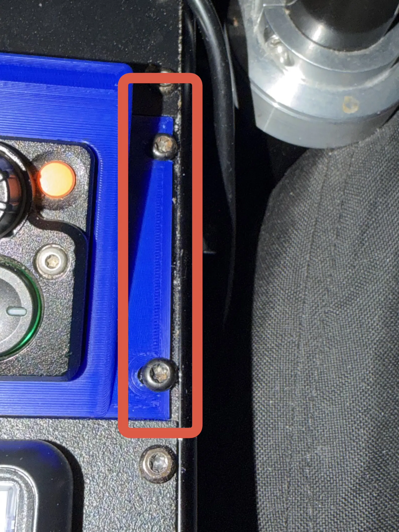 Sau đó tôi in phần ngàm chính, dùng keo superglue dán các “tai” vào ngàm chính. Rồi gắn đầu điều khiển (Radio Head) Motorola APX-8500 lên bản prototype nhựa PLA màu xanh. Tôi lắp nó vào cụm center console của Dodge Durango. Bên phải bị thiếu 0.08” (version-12), trong hình có khung đỏ đánh dấu khe hở. Tôi cũng không rõ sao lại bị vậy.