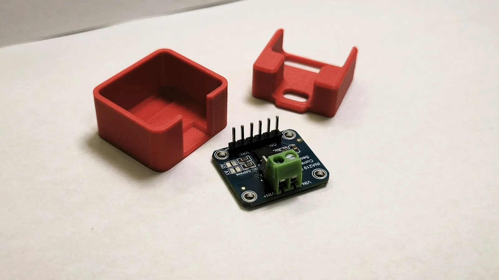 Nắp che/vỏ enclosure dạng snap-fit 2 phần cho module INA219 I2C đo dòng/điện áp/công suất. Chỉ cần đặt PCB vào và bấm khớp, không cần ốc. Đã test độ khít trên Prusa MK4; có thể chấm keo CA nếu muốn cố định.
