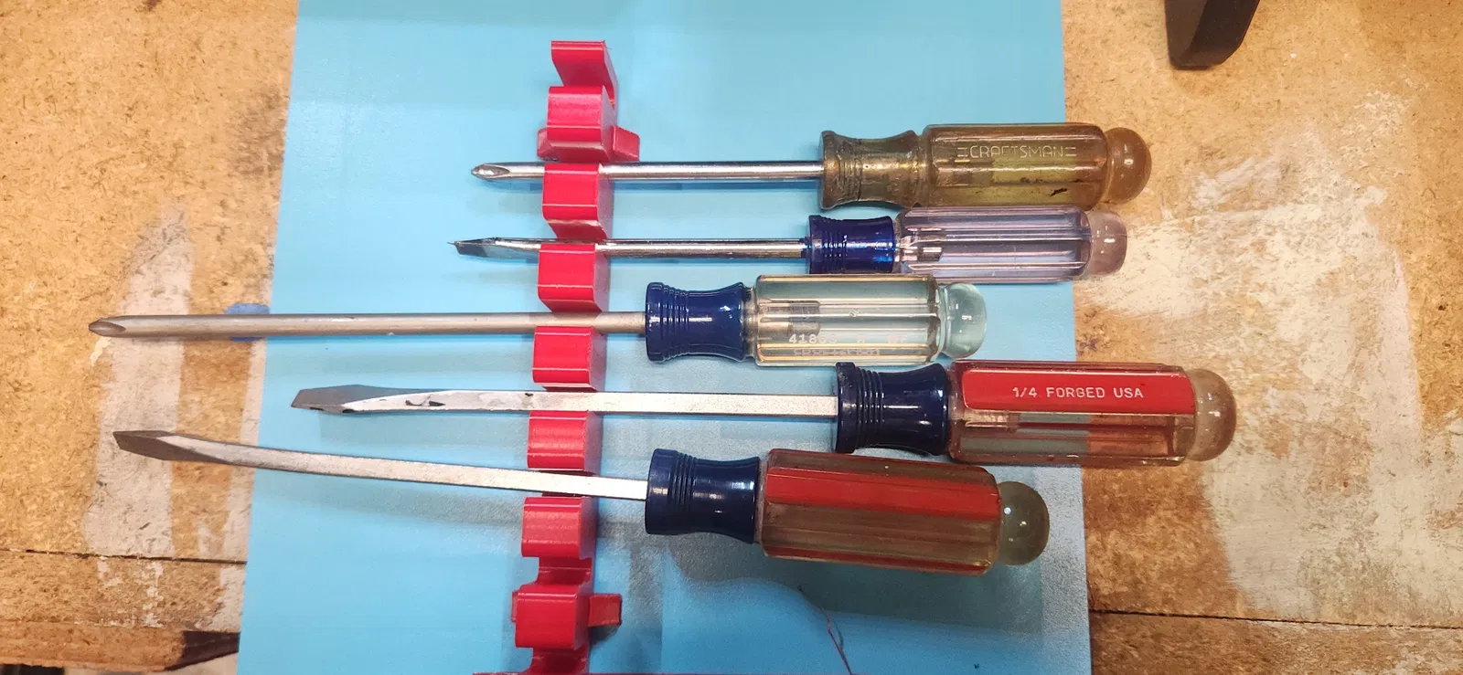 Khay rack có rãnh đơn giản giúp căn thẳng và sắp xếp tua vít gọn gàng trong ngăn kéo tủ đồ nghề. Tác giả lưu ý khoảng cách rãnh có thể hơi sát; nếu thiết kế lại sẽ cập nhật file.