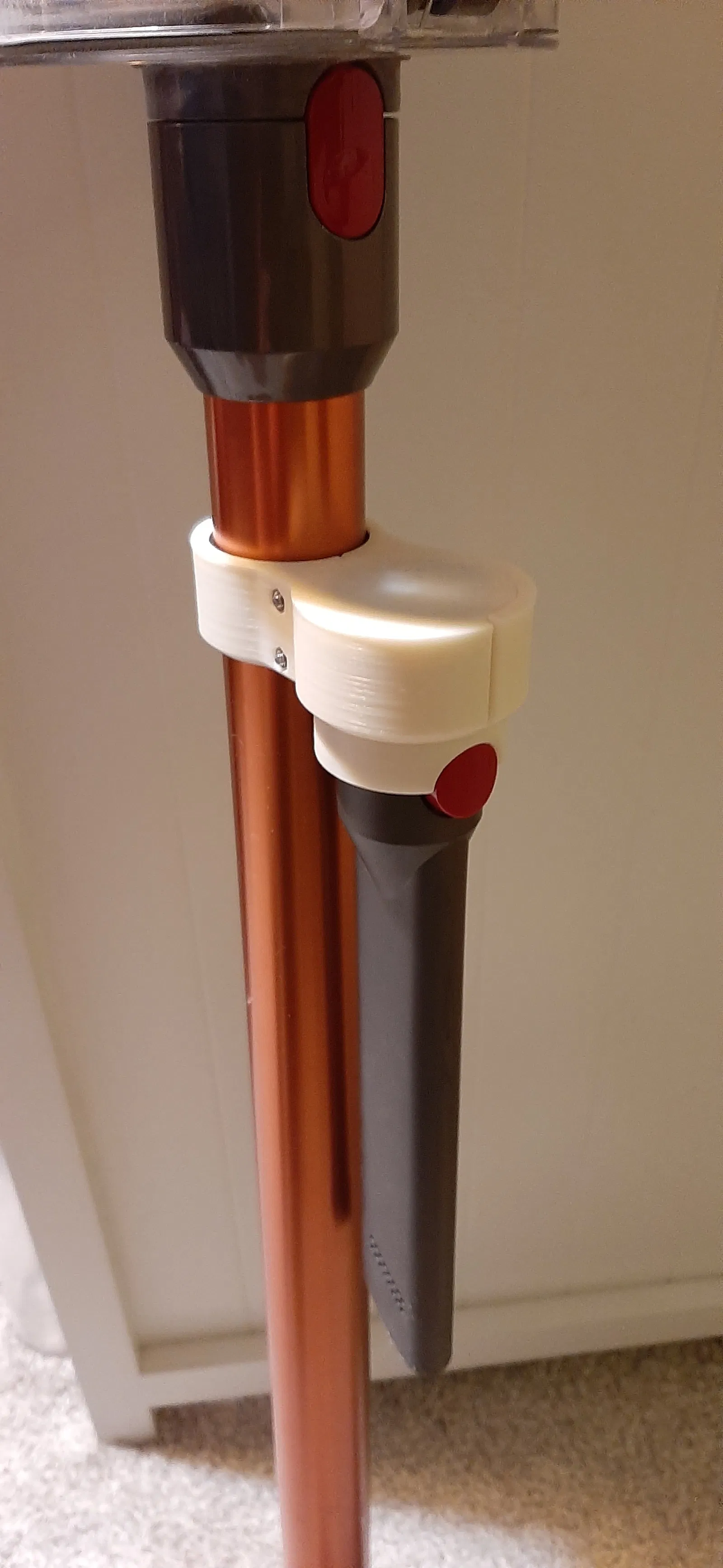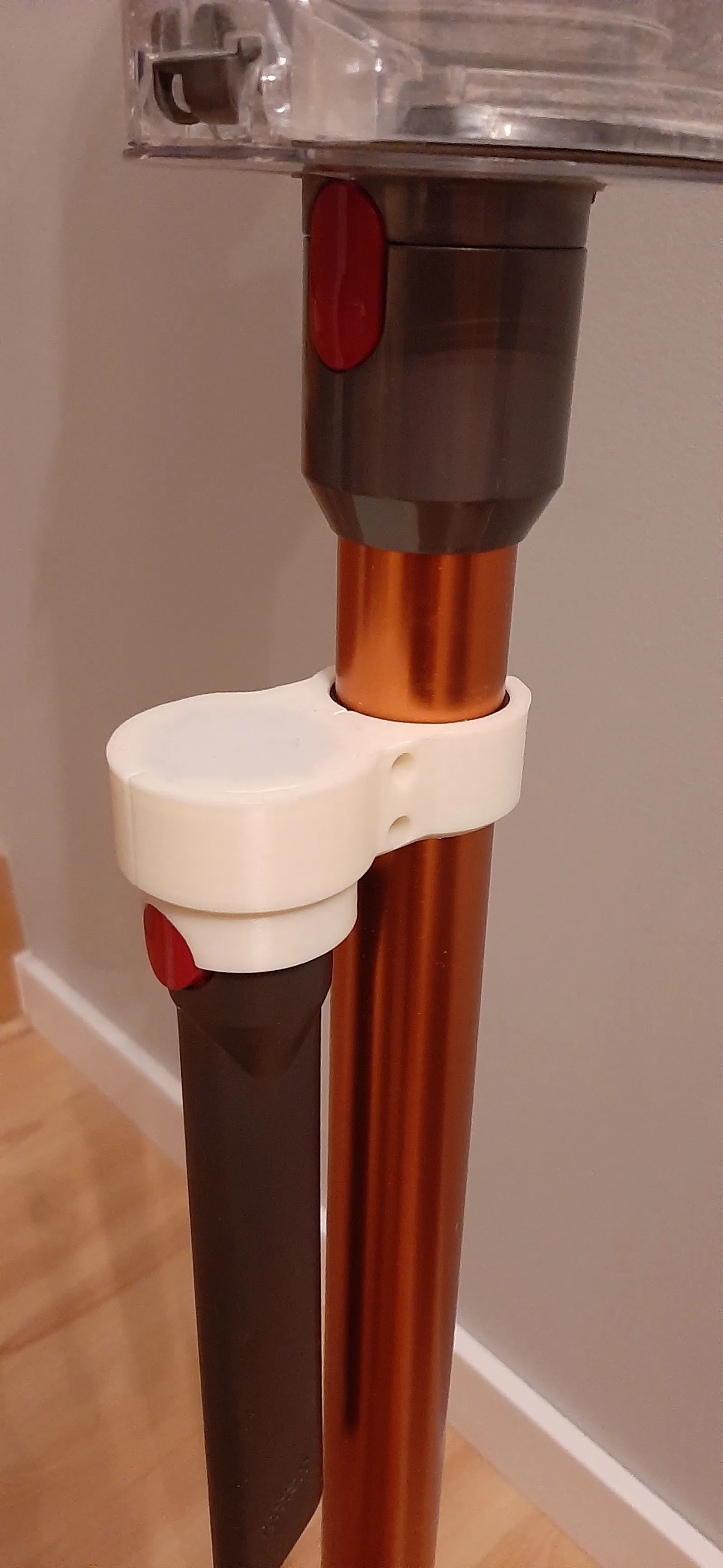 Giá đỡ để gắn thêm 1 phụ kiện/đầu hút Dyson không có electrical socket ngay trên máy hút bụi, giúp thao tác vệ sinh tiện hơn. Khuyên dùng tăng wall thickness, không cần support; có thể thêm miếng TPU/cao su chống trượt.