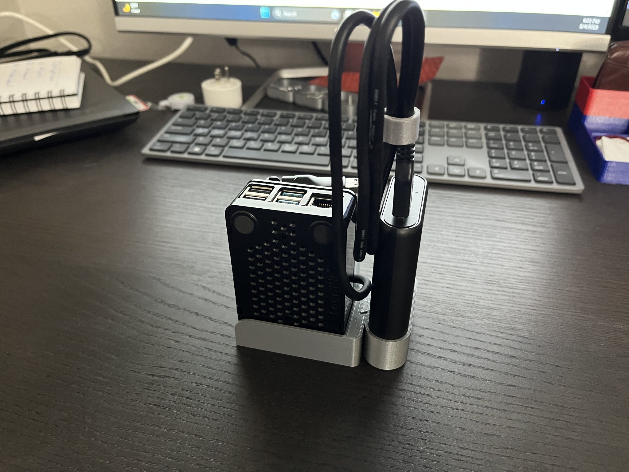 Để đảm bảo tính di động của thiết lập này và giữ cho các thành phần thiết yếu như bộ chuyển đổi USB Wi-Fi, pin và hộp thẻ SD được tổ chức gọn gàng, tôi đã tự thiết kế và in 3D một giá đỡ. Giá đỡ này hiệu quả trong việc giữ cho hộp Raspberry Pi 4 của Canakit, bộ chuyển đổi USB Wi-Fi và pin được sắp xếp gọn gàng và compact.