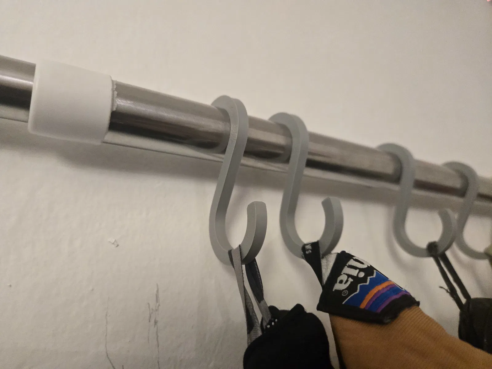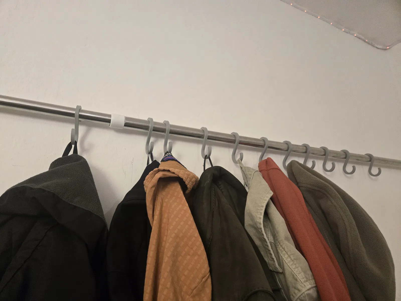 Một cái móc treo áo đơn giản dạng chữ S, đường kính trong 2.2 cm. Mẫu này được thiết kế cho một cây/ống tròn đường kính 2 cm, và cũng nên dùng ổn với loại nhỏ hơn.