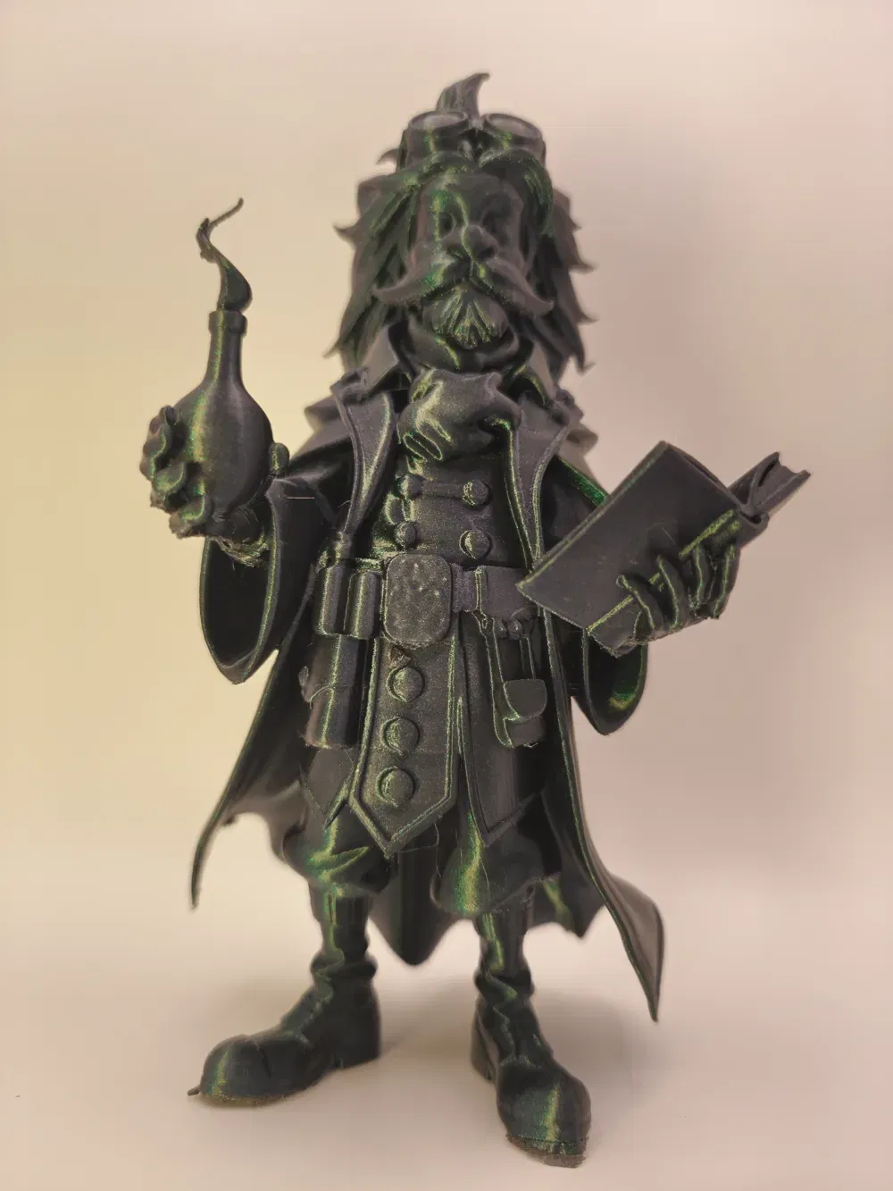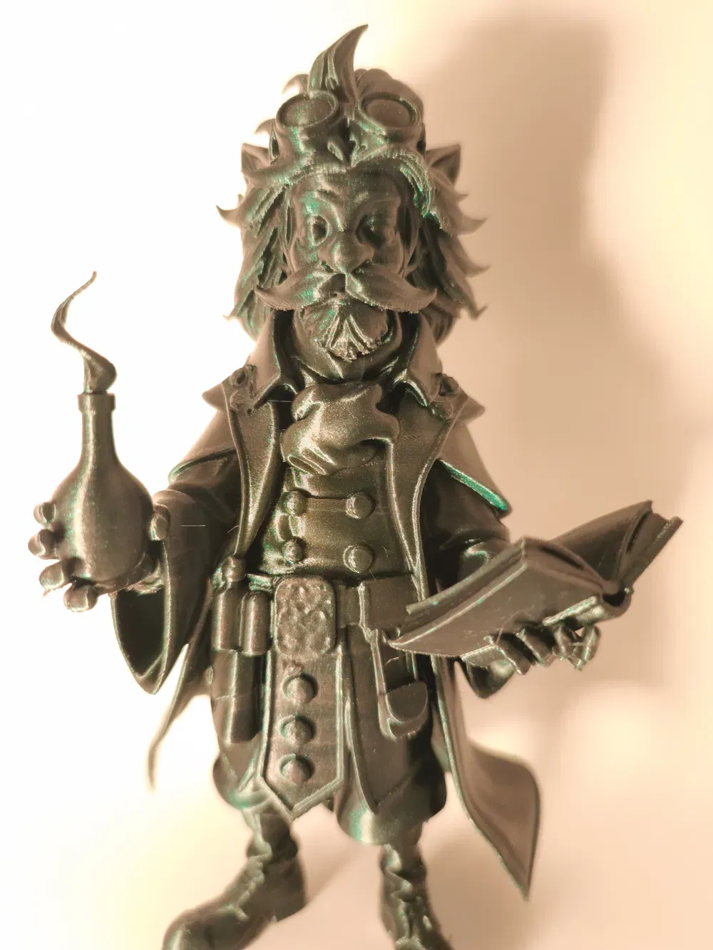 Mẫu Steampunk Alchemist Figure phong cách steampunk: nhân vật áo choàng, râu và goggles, kèm quyển sách và chai thuốc. Có gợi ý thông số in (0.12mm, infill 15%, Organic Tree supports) và quy trình hoàn thiện bằng Meshy AI, Blender, Meshmixer.
