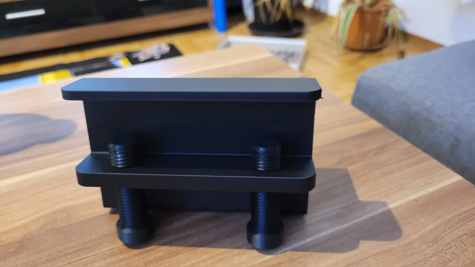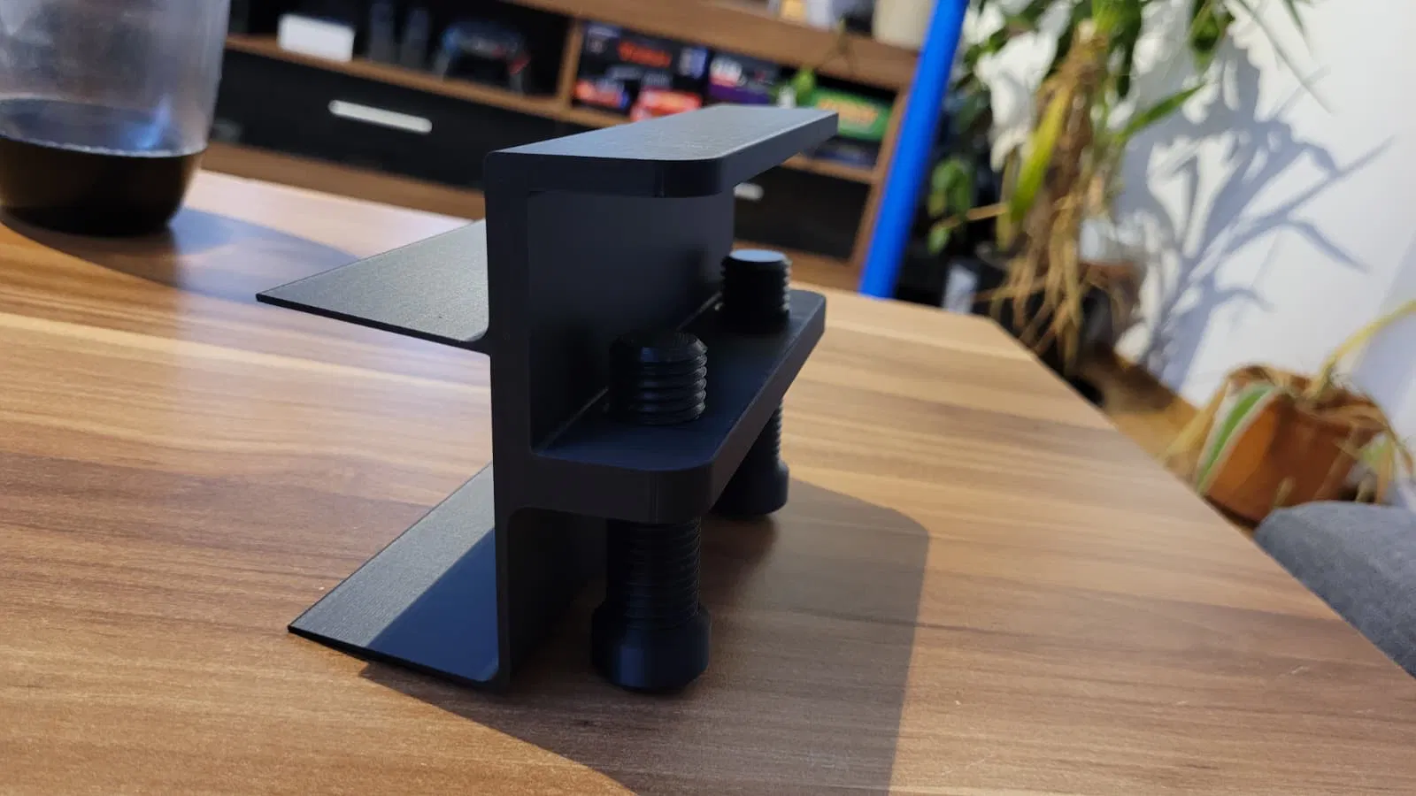 Giá đỡ remote dạng kẹp, gắn vào mép bàn hoặc bệ cửa sổ. Chứa được 2 remote cỡ trung; remote dài vẫn vừa nhưng có thể hơi thiếu ổn định. Bolt đã scale 96% trong .3mf, khuyên layer height <0.2mm. Kẹp tối đa 45mm.