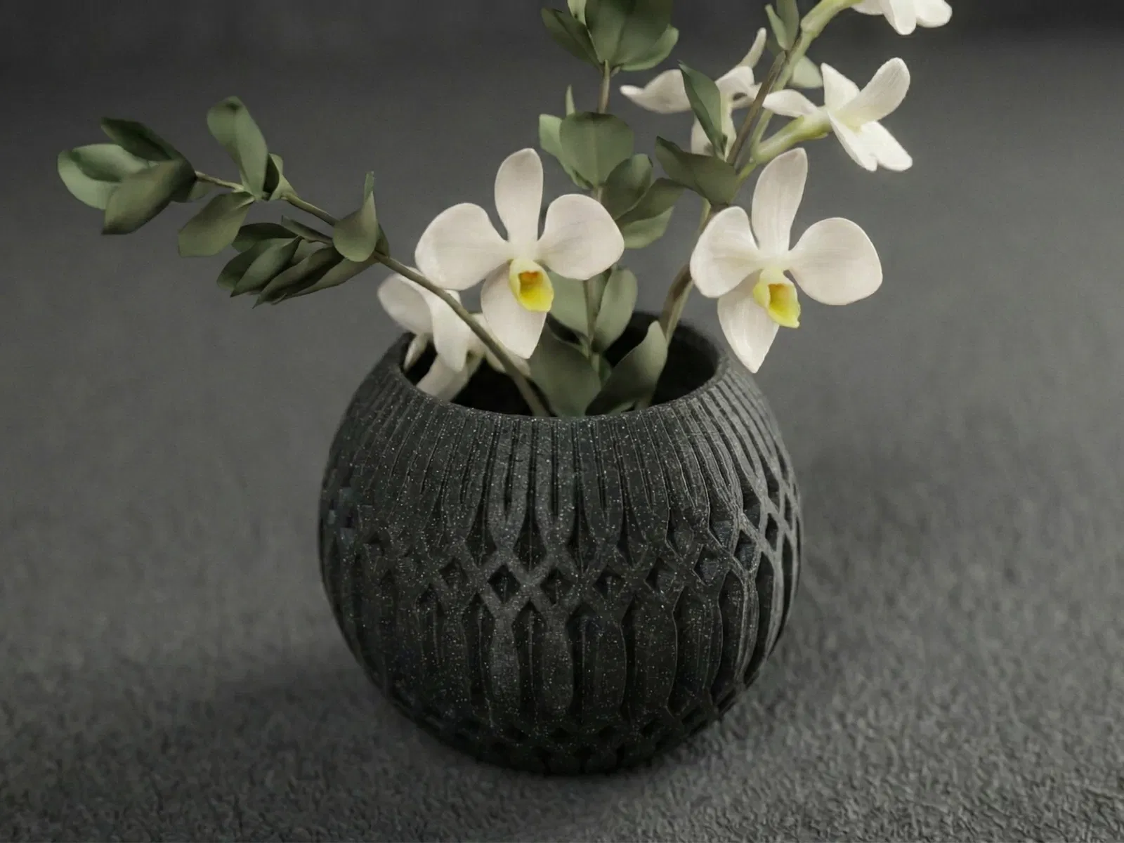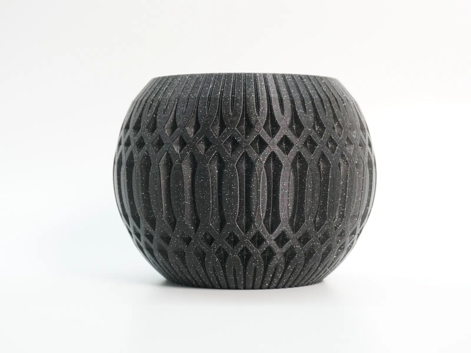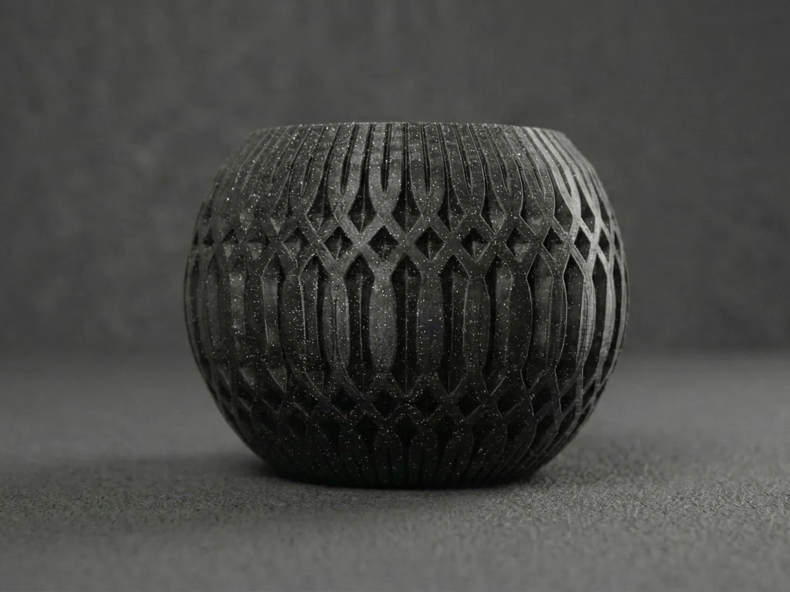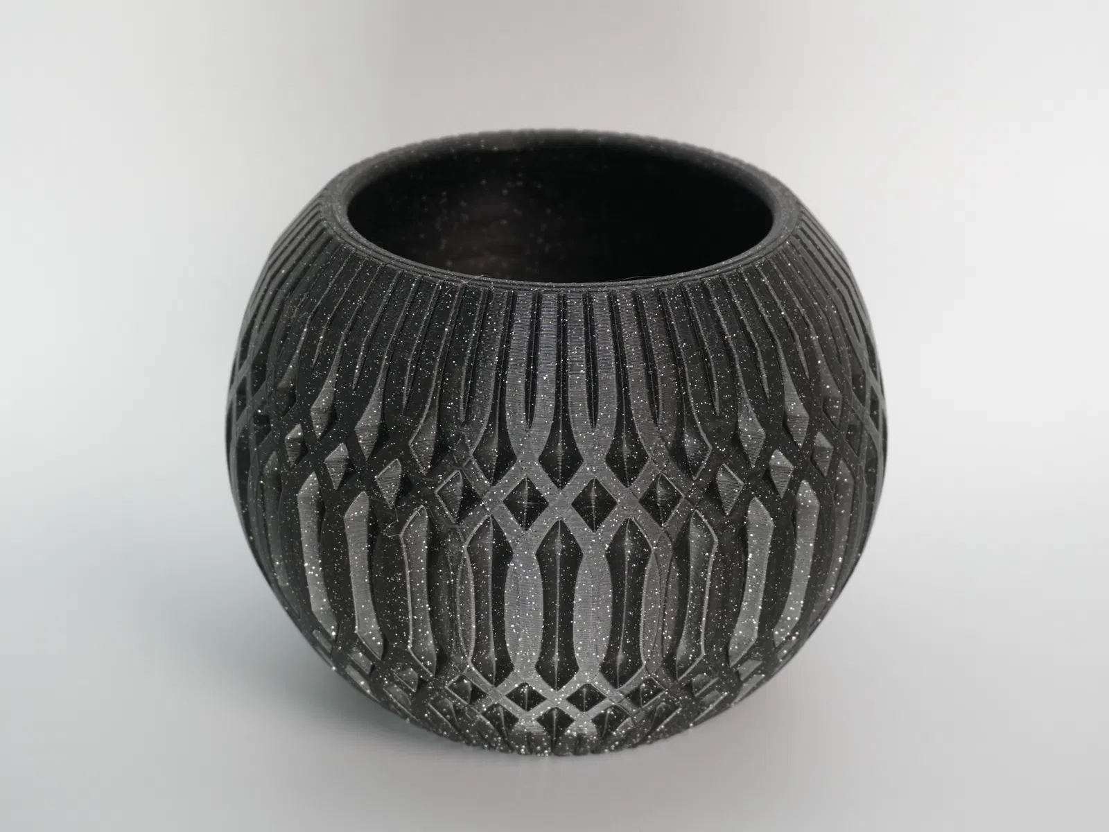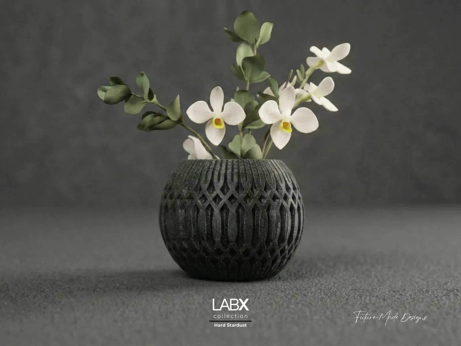 Hard Stardust là mẫu chậu/bình decor hình học sắc cạnh với bề mặt diamond texture sâu, tạo hiệu ứng phản chiếu như “bụi sao” khi gặp ánh sáng. Hợp in Metallic PLA, Matte PLA tông tối; có thể tăng Wall Loops để cắm hoa tươi.