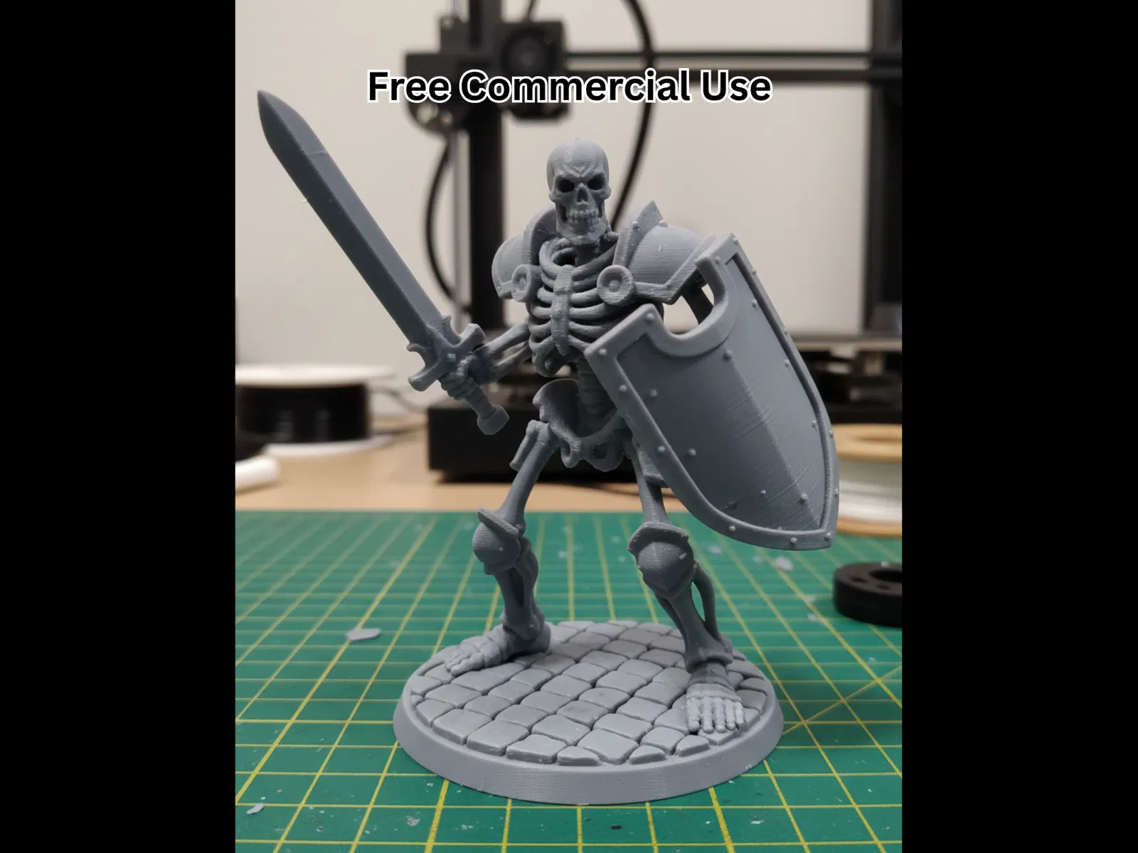 Mô hình mini Undead Skeleton Champion này là một chiến binh bộ xương mặc giáp, cầm swordshield. Các cấu trúc xương được làm dày hơn để đảm bảo độ bền và in FDM ổn định. Những mảng giáp và mép vũ khí được gia cường, đồng thời tránh đi vào quá nhiều chi tiết siêu nhỏ. Phần sculpt cân bằng giữa phong cách fantasy rùng rợn và độ chắc chắn, phù hợp để cầm nắm, sử dụng lặp lại trên bàn chơi tabletop. Được tối ưu để in sạch ở chiều cao lớp 0.2mm với hình khối rõ, dễ nhìn. Bản in dùng PLA dạng matte, thấy nhẹ các đường lớp FDM ngang. Hình trưng bày là ảnh thật chụp bàn làm việc bằng smartphone kiểu amateur, ánh sáng trong nhà tự nhiên và nền sau hơi bừa một chút.