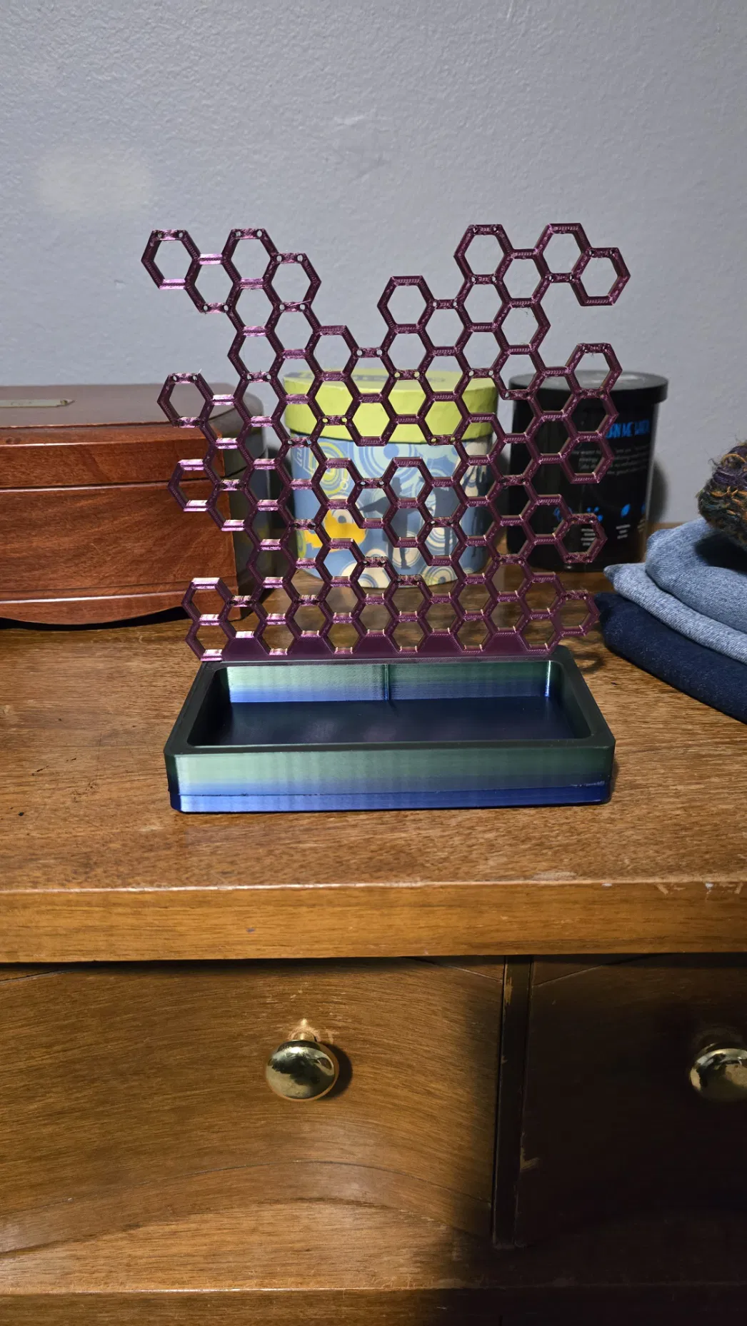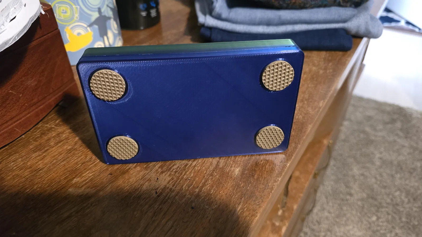 In với mặt khay hướng lên trên. Nếu bạn in phiên bản có rãnh/slot để gắn miếng đệm cao su (rubber pad), mình có dùng supports. Phần khay có thể in kèm các lỗ cho chân, và bạn có thể để nguyên supports nếu còn đang phân vân có gắn thêm miếng đệm cao su tùy chọn hay không.