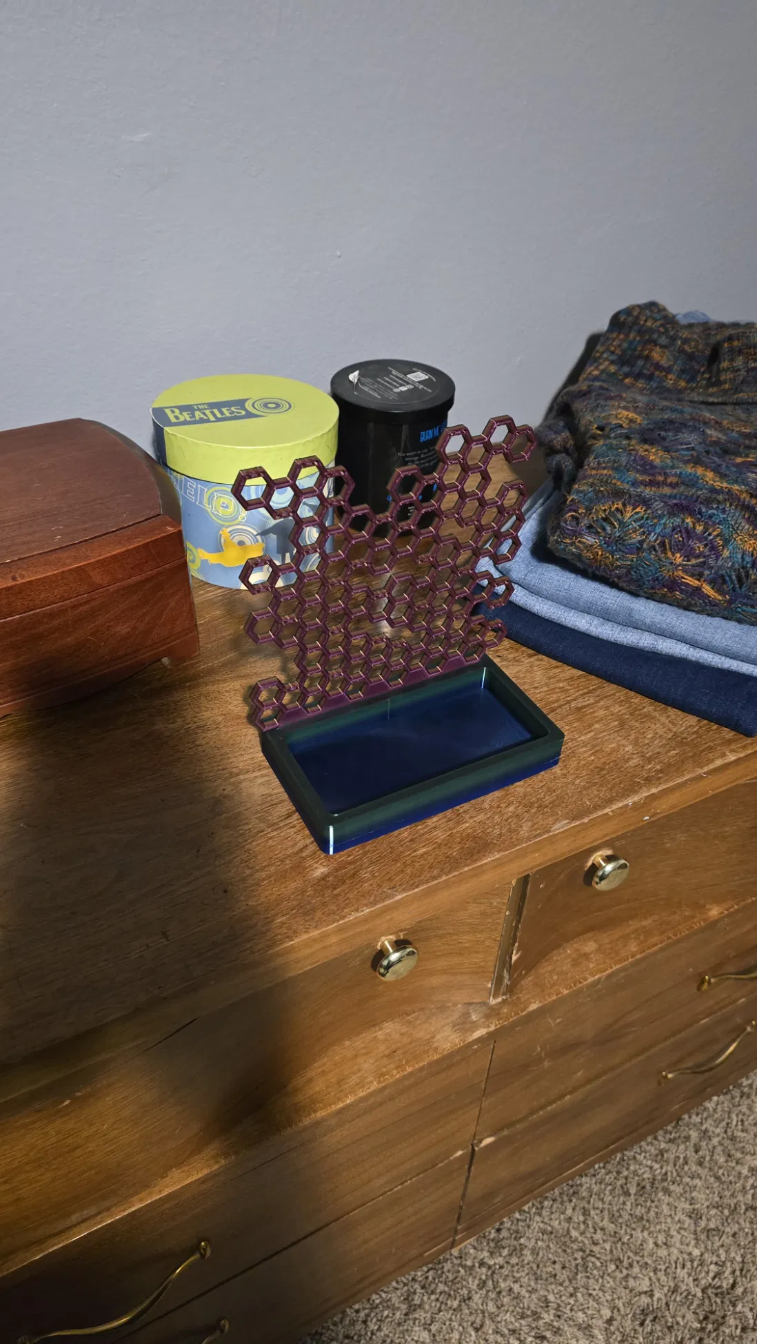 Giá treo/trưng bày bông tai kèm đế có ngăn lưu trữ, có tùy chọn rãnh gắn miếng đệm cao su chống trượt. In với mặt khay hướng lên; bản có slot cao su nên dùng supports và có thể để lại nếu chưa quyết.