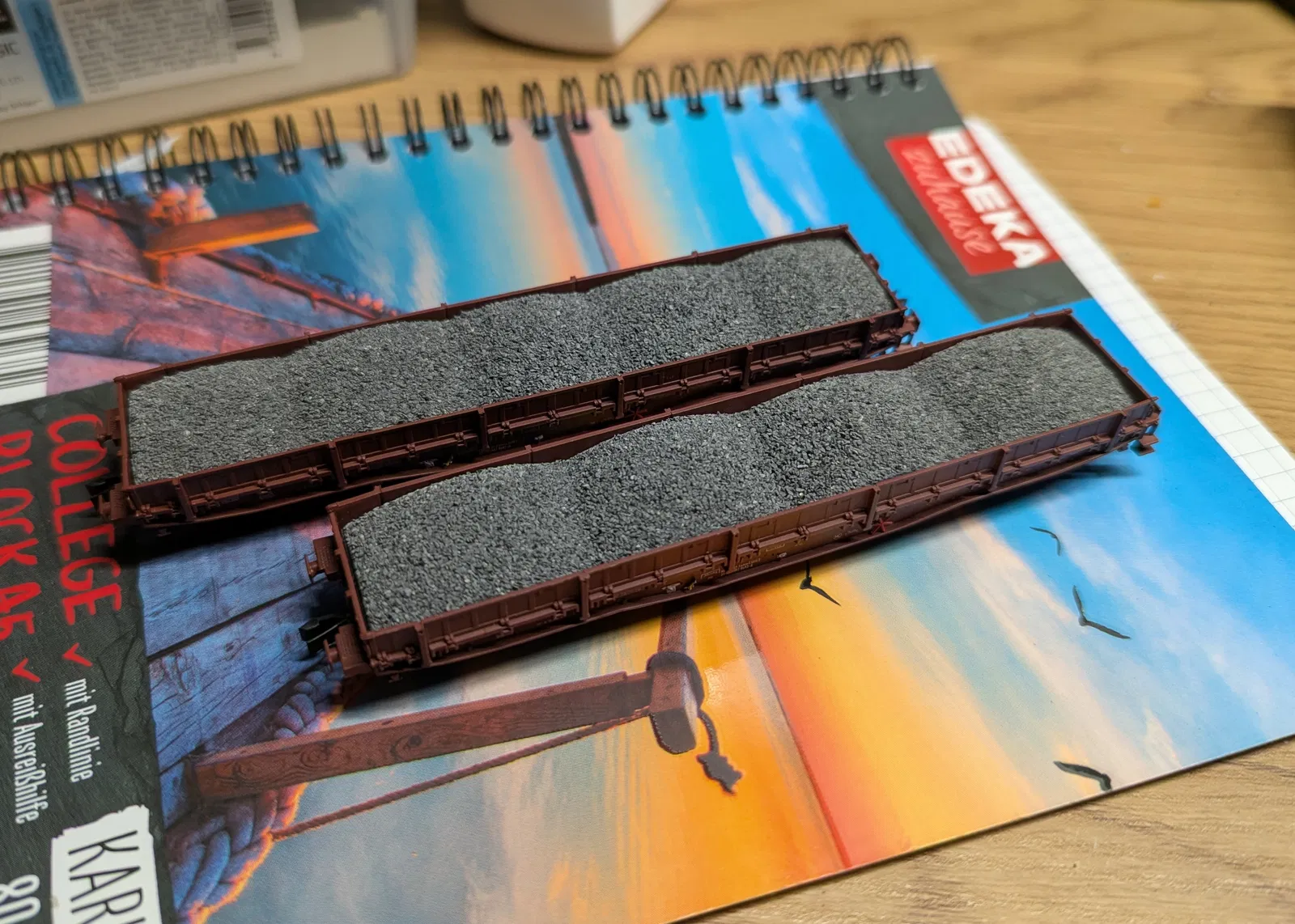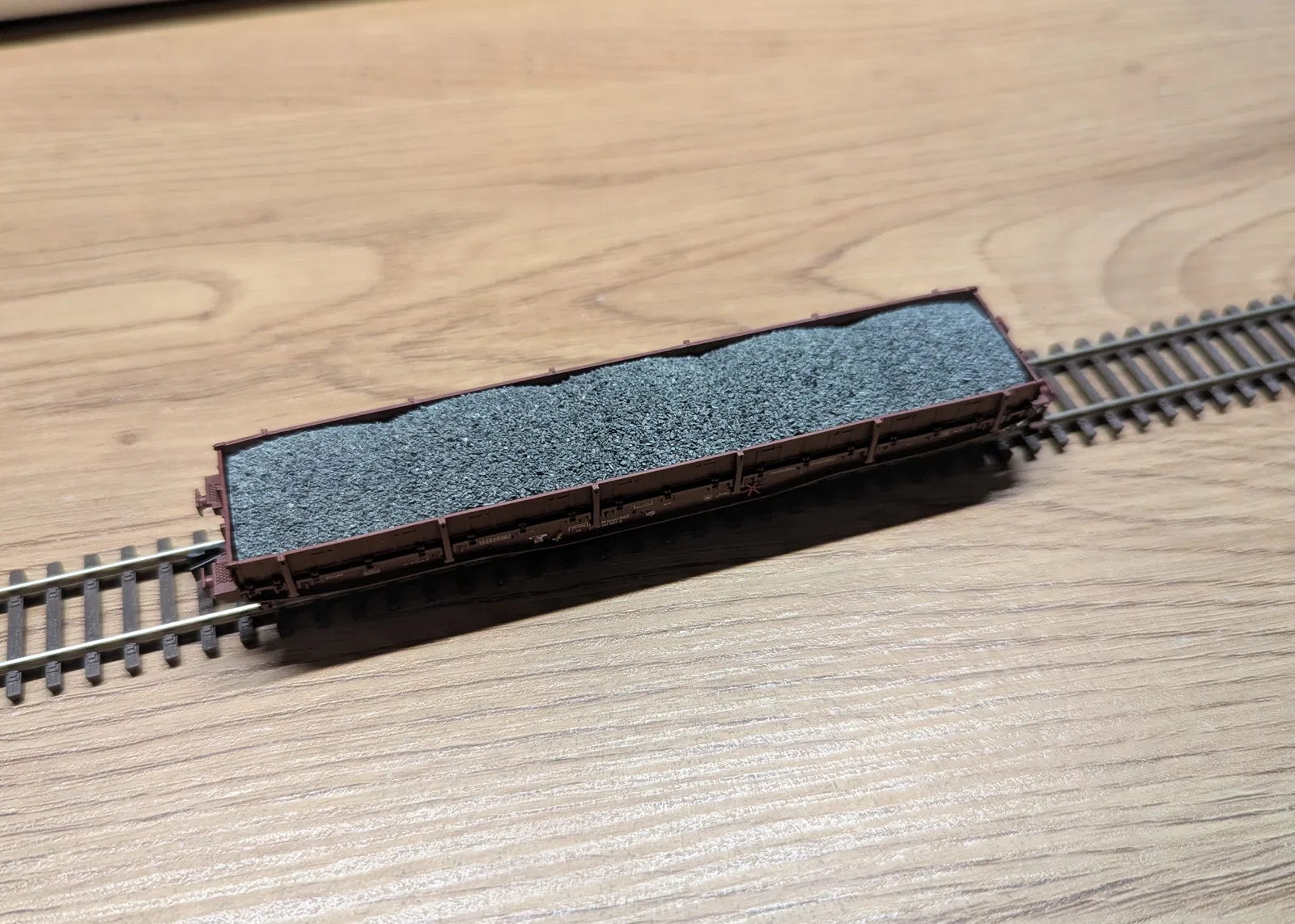Chà nhám các góc và canh cho vừa vào toa. Sau đó lấy ra, quét keo sữa (Weißleim) nguyên chất, rồi rắc đá ballast hoặc cát thật nhiều lên bề mặt. Nếu cần thì ấn nhẹ cho bám. Đợi khô một lúc, gõ/rũ cho rơi phần vật liệu rắc dư và làm sạch phần viền khỏi vật liệu bị dư ra.