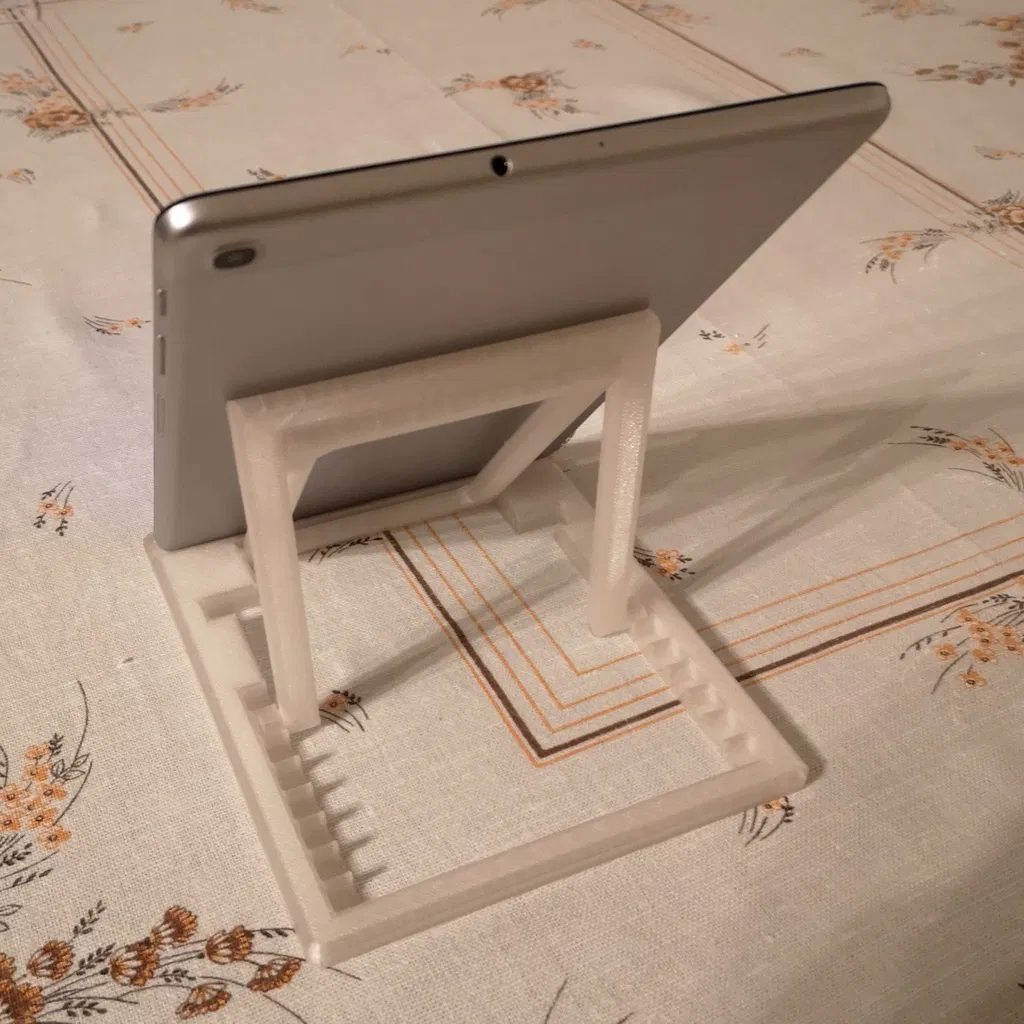 Giá đỡ Tablet gọn nhẹ cho Samsung Galaxy Tab 10.1, chỉnh được nhiều góc. In không cần support, in xong dùng liền không phải lắp ráp. Có lỗ gắn chân cao su (TPU) hoặc chấm keo nến. Bản V2 cần printbed lớn hơn.