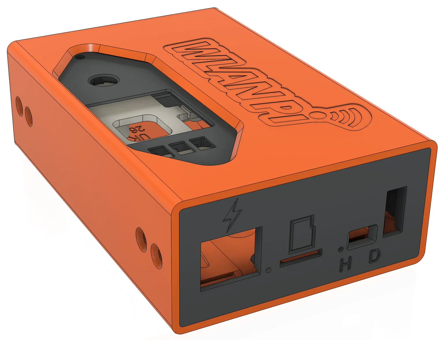 Thiết kế của vỏ case không chỉ chú trọng vào tính năng bảo vệ mà còn mang đến sự tiện dụng tối đa cho người dùng. Các cổng kết nối quan trọng như cổng nguồn, khe cắm thẻ nhớ microSD, cổng Ethernet và các cổng tín hiệu khác đều được khoét lỗ cẩn thận, đảm bảo bạn có thể dễ dàng truy cập và sử dụng mà không cần tháo rời vỏ. Mặt trên của vỏ còn được khắc chìm logo "WLAN Pi" và biểu tượng sóng Wi-Fi cách điệu, vừa tăng tính nhận diện thương hiệu, vừa tạo điểm nhấn thẩm mỹ độc đáo, thể hiện cá tính của người sở hữu.