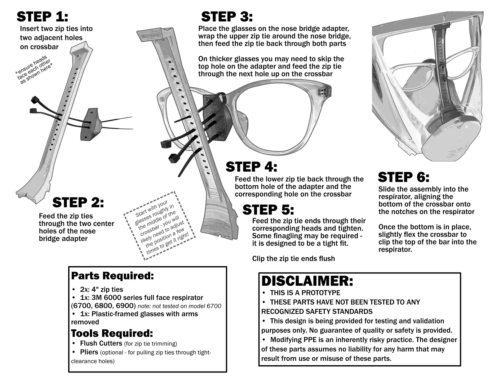 Bộ chi tiết giúp cố định kính (đã tháo càng) bên trong mặt nạ full face 3M 6000 series. Crossbar gài bằng lực căng và siết zip tie; nose bridge adapter (khuyên in TPU) để chỉnh góc và giữ chắc hơn.