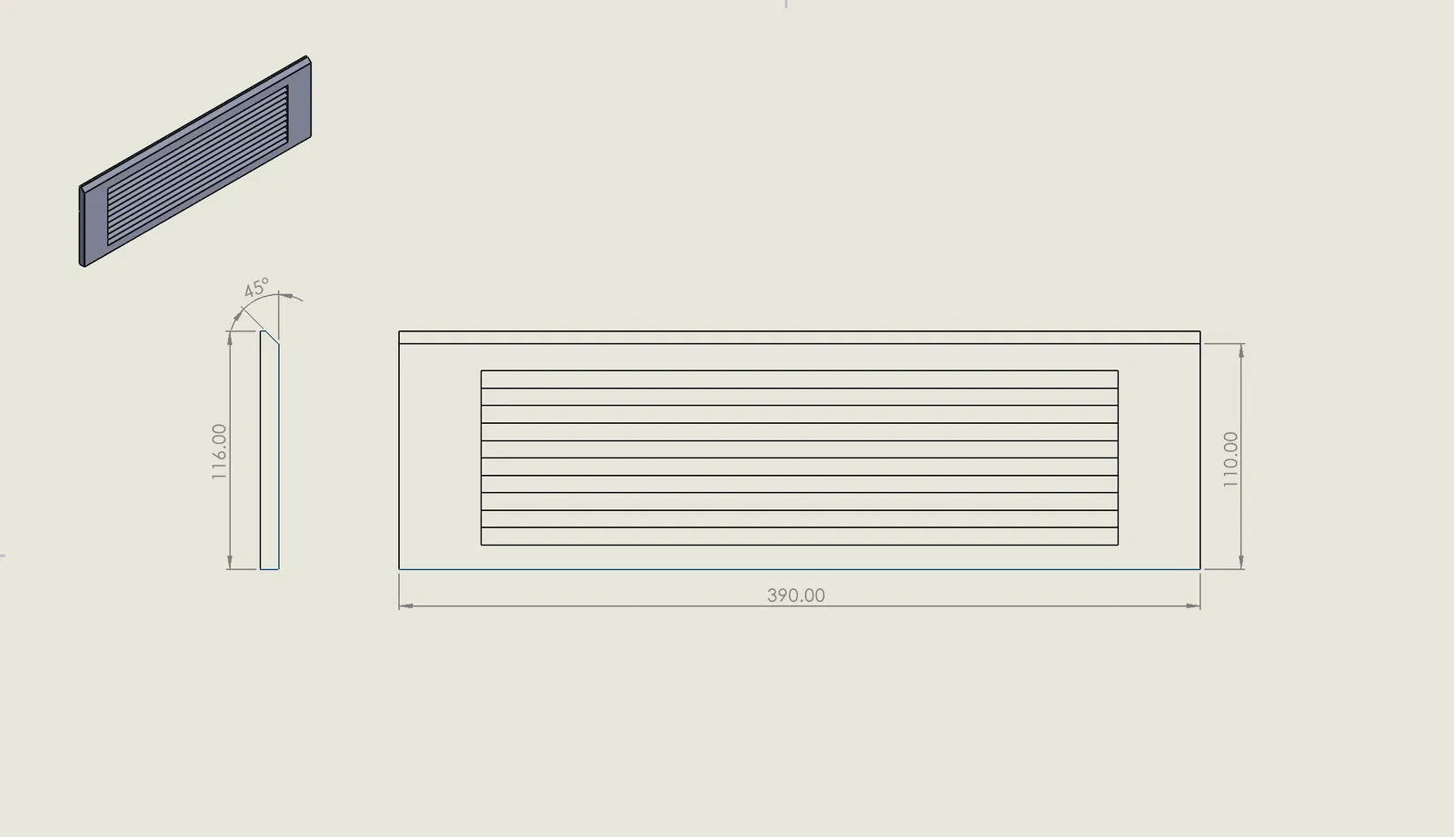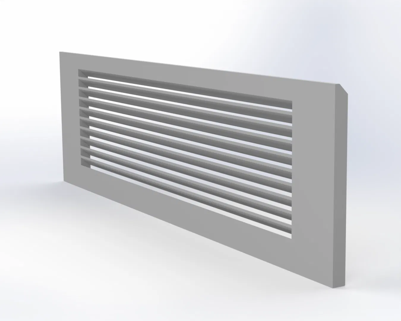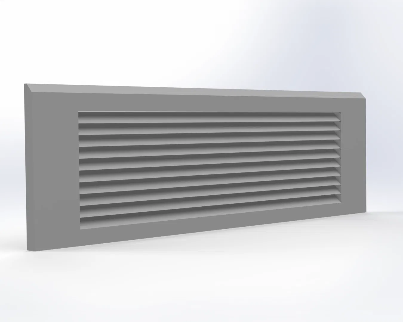 Mẫu Baseboard Vent Cover thay thế cho cửa hồi gió đặt sát sàn hoặc gắn tường ở khu vực chân tường. Kích thước tổng thể 390 × 116 mm (cho baseboard cao 116 mm), có louvers ngang và vát 45° để ôm sát nẹp.