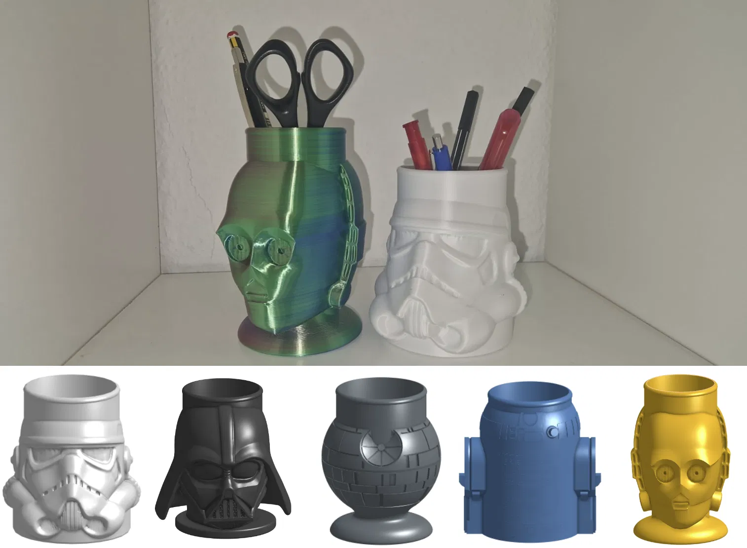 Biến bàn làm việc của bạn trở nên độc đáo và phong cách với bộ sưu tập "Star Wars Pencil Cup Collection". Bộ sản phẩm gồm 5 mẫu hộp cắm bút lấy cảm hứng từ các nhân vật và biểu tượng kinh điển của Star Wars như Stormtrooper, Darth Vader, Death Star, R2-D2 và C-3PO. Không chỉ giúp sắp xếp gọn gàng bút, viết, kéo và các vật dụng nhỏ khác, những chiếc hộp này còn là món đồ trang trí ấn tượng, thể hiện cá tính của người sử dụng. Dễ dàng in 3D bằng nhiều loại vật liệu và màu sắc, đây chắc chắn sẽ là món quà tuyệt vời dành cho fan Star Wars.