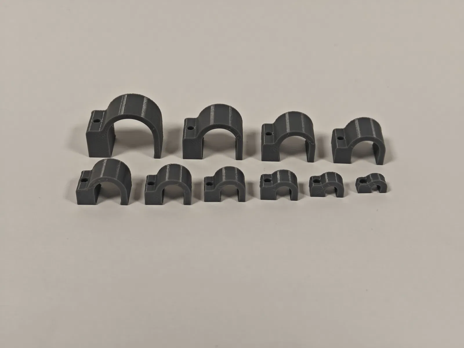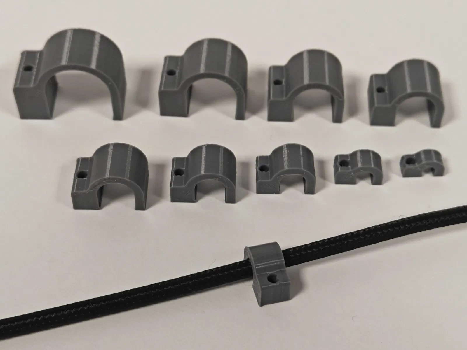 Bộ kẹp dây đóng đinh kiểu cổ điển để cố định dây dọc baseboard, tường hay khung cửa. Gồm 10 size từ 3–15mm, dùng đinh tiêu chuẩn 2mm. Khuyến nghị in PETG/ABS, infill 100%, không cần support.