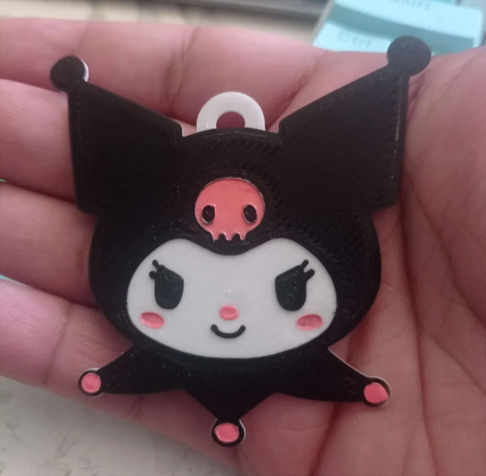 Charm Kuromi (Sanrio) dạng đơn giản: in trắng 0.2mm, cho máy dừng sau layer 10 rồi đổi sang đen cho 3 lớp cuối để tạo line. Chi tiết có thể tô thêm bằng enamel hoặc sơn móng tay.