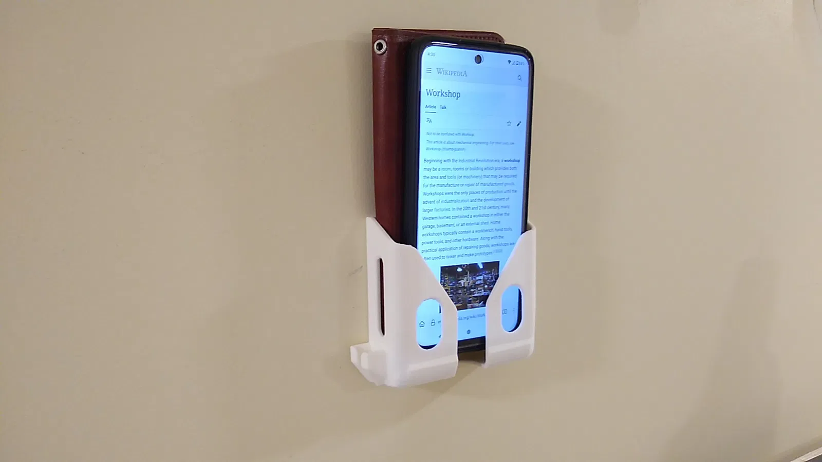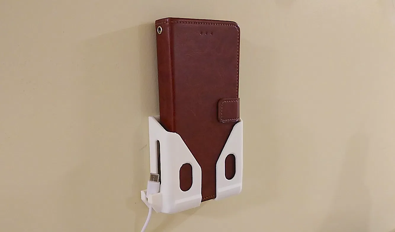 Giá treo tường cho điện thoại, để vừa cả máy đang dùng ốp dày và có kẹp giữ dây sạc bên hông (hợp đa số USB-C). Thiết kế tối ưu vật liệu dưới 50g, có lỗ bắt vít dễ chỉnh thẳng và nhìn màn hình rõ hơn.